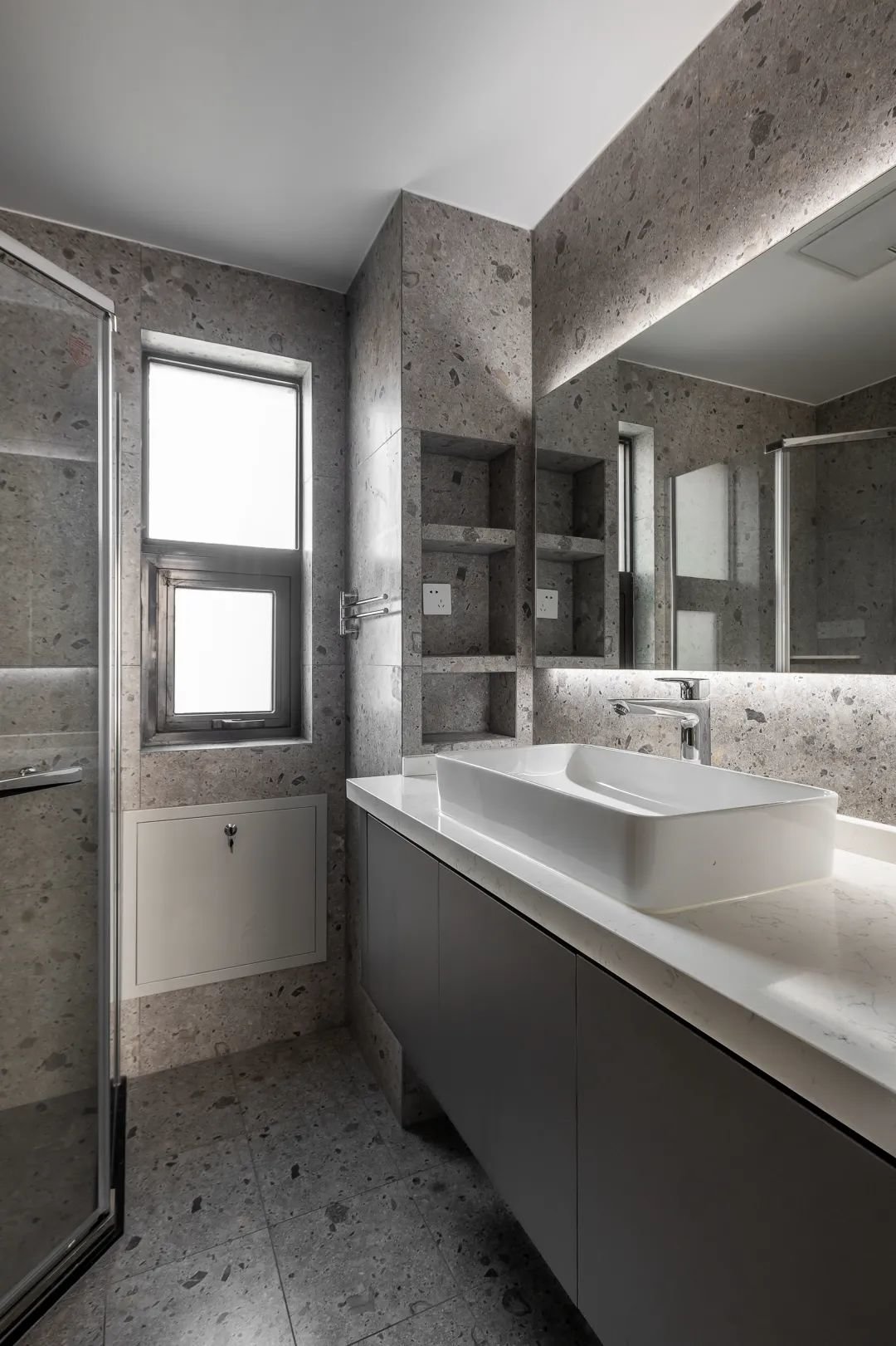 ▲卫生间是水磨石的地砖与墙面砖,洗手盆旁边还设置了壁龛,台上盆+带背光的镜子,布置出一个实用而又优雅的卫浴空间。