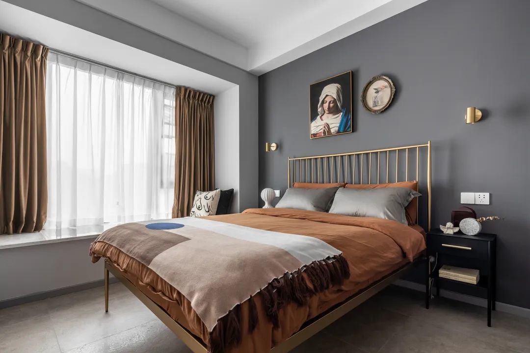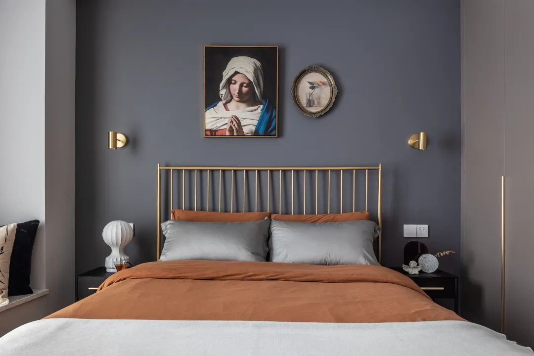▲次卧空间是木地板+灰色墙,摆一张金属窗,布置浅棕色床单,床头墙挂上方形+圆形装饰画,床头两侧装上金属质感的壁灯,营造出一个情趣精致的卧室氛围。