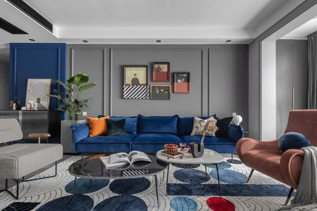 ▲客厅天花吊平顶加入暗藏筒灯,电视墙是定制柜设计,沙发墙是灰色带边框造型,布置蓝色布艺沙发,整个空间再加入颜色鲜艳丰富的软装布置,让客厅空间显得轻奢高级而又鲜艳华丽。