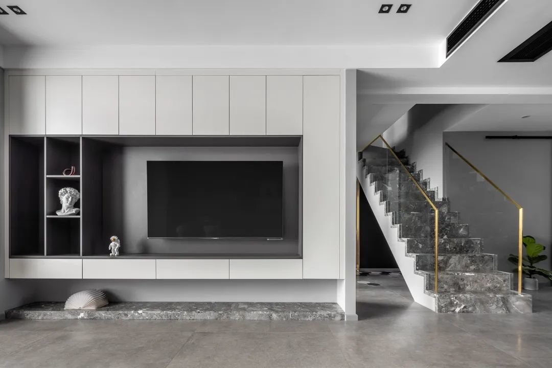 ▲电视墙的电视柜是定制收纳柜,中间加入灰色的开放格与壁挂电视机位,下方装一个灰色大理石地台,地台与灰色地面、楼梯材质呼应,布置了一个收纳强大、时尚优雅的客厅画面。