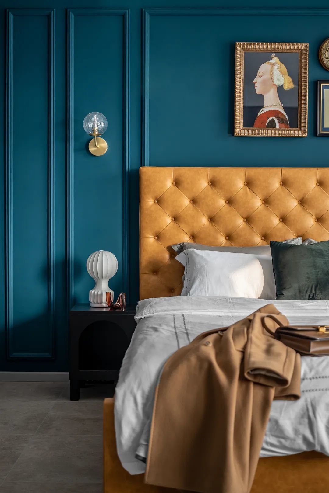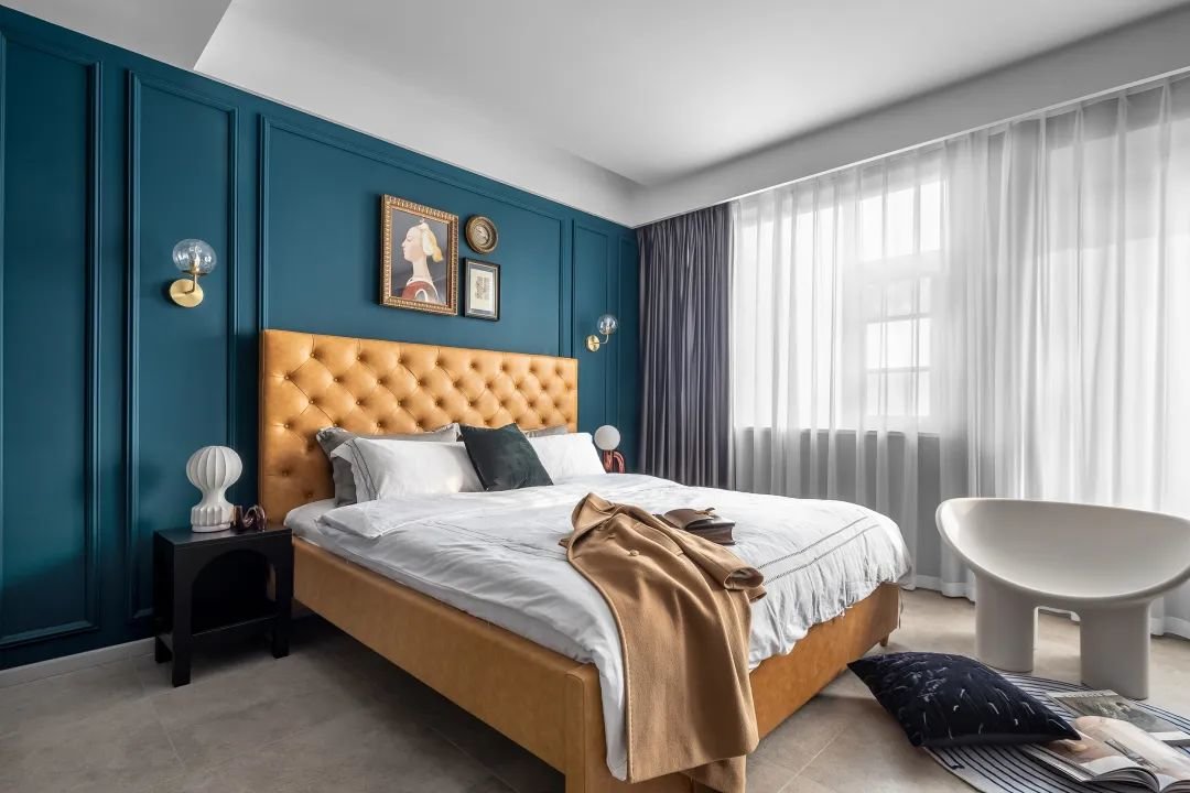 ▲安静的蓝色与温馨的焦糖色,再加上艺术装饰画,让卧室也有了温馨优雅的艺术气质。