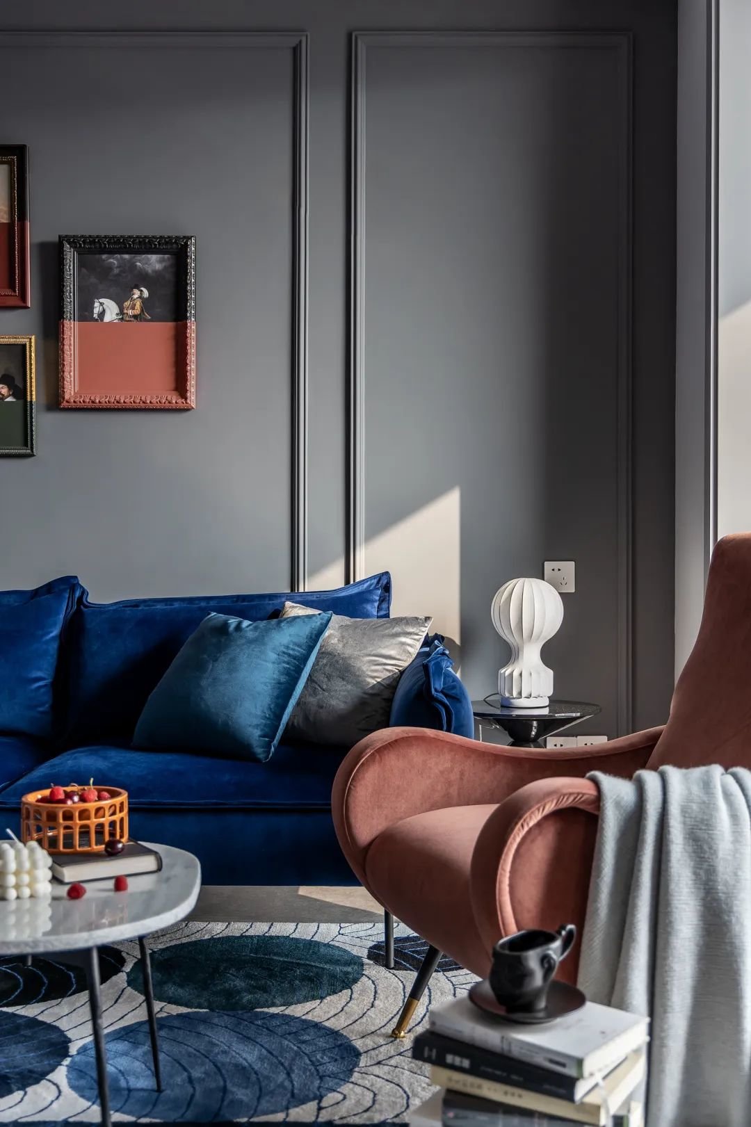 ▲沙发墙是灰色的墙面空间,加入边框造型,挂上一组颜色鲜艳的装饰画,布置深蓝色的布艺沙发,还有白色带蓝点。