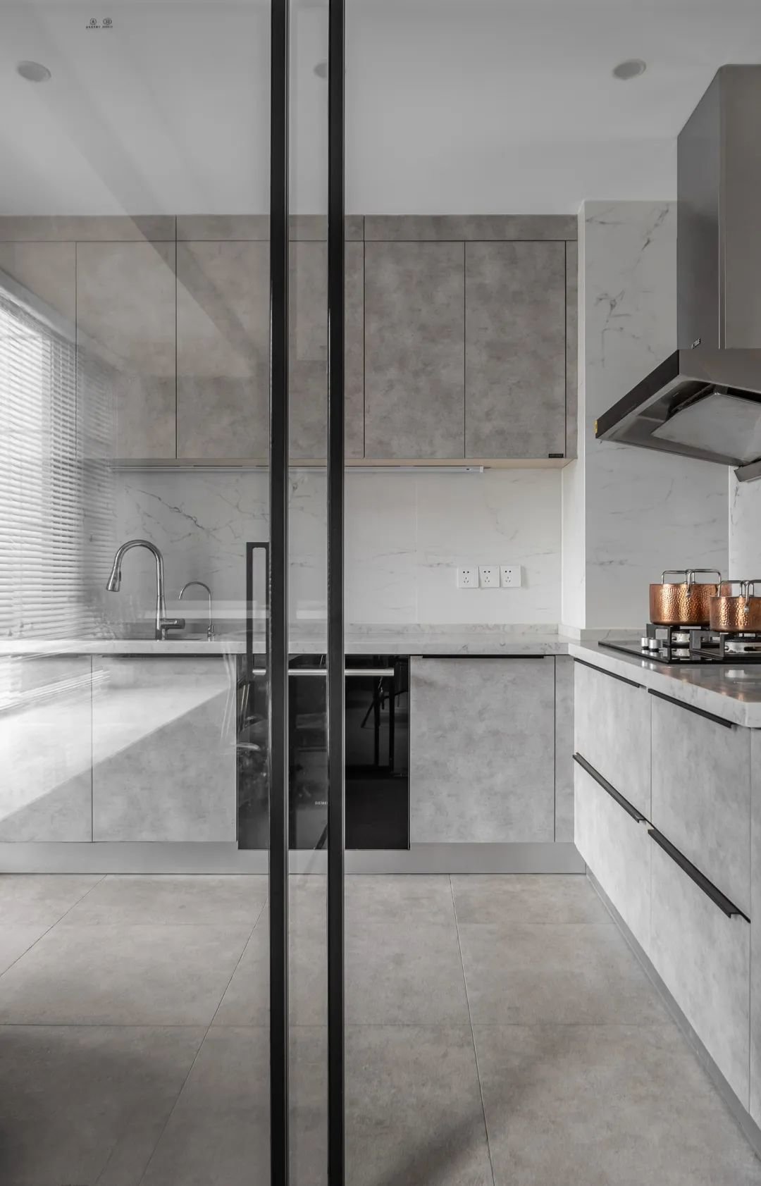 ▲厨房以灰色地面+橱柜定制,加入黑色五金、雅白的墙面,做出了一个时尚优雅的高级黑白灰效果。