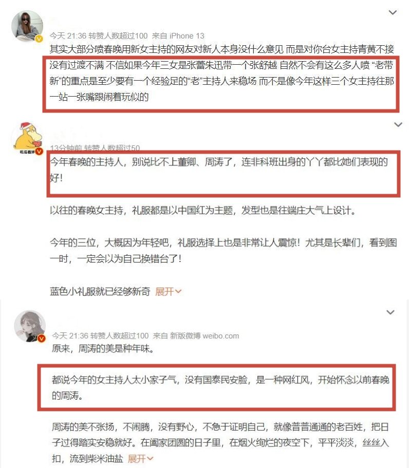 观众为什么对这次春晚女主持人的组合会有这么大的反应?归根到底还是央视太急于推新人了。三位主持人都算是春晚新人,没有严格意义上的核心。央视的主持人这几年经历了“青黄不接”,主持人辞职的不少。为了改变这种情况,还在2019年举办了主持人大赛。有好几位都是通过主持人大赛成功进入央视,包括今年春晚的新人主持人王嘉宁。为了能够快速让主持人成长,春晚也成为了“练兵场”,从2020年开始,已经连续四年春晚,推新人主持了。只是在前三年还采用“老带新”,今年春晚的三位女主持人,基本上还都是“新人”。