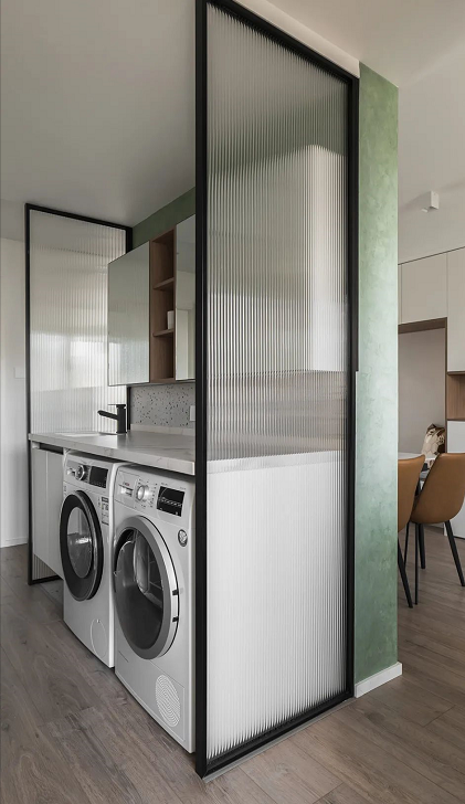 过道是最容易被忽视的空间,其实用来打造家政间非常实用。卫生间门口的过道离排水管较近,改水电相对来说简单一些,适合打造家政区。