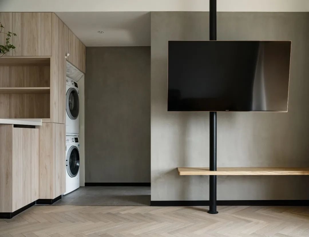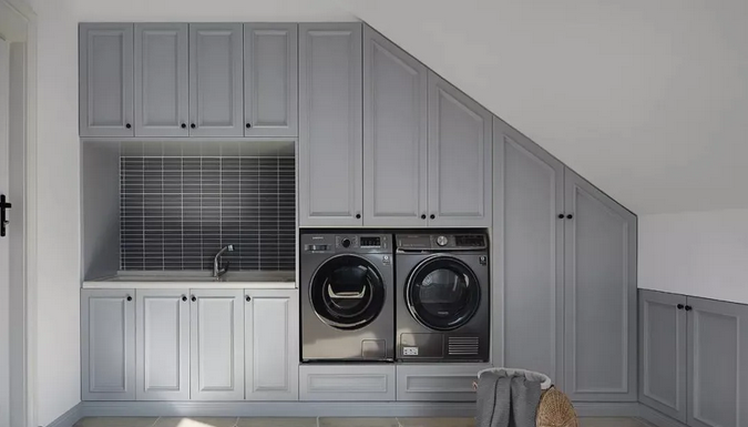 对于LOFT、复式、跃层的户型来说,楼梯下方空间比较难利用,可以将其打造成家政区,还能增加家庭储物能力!