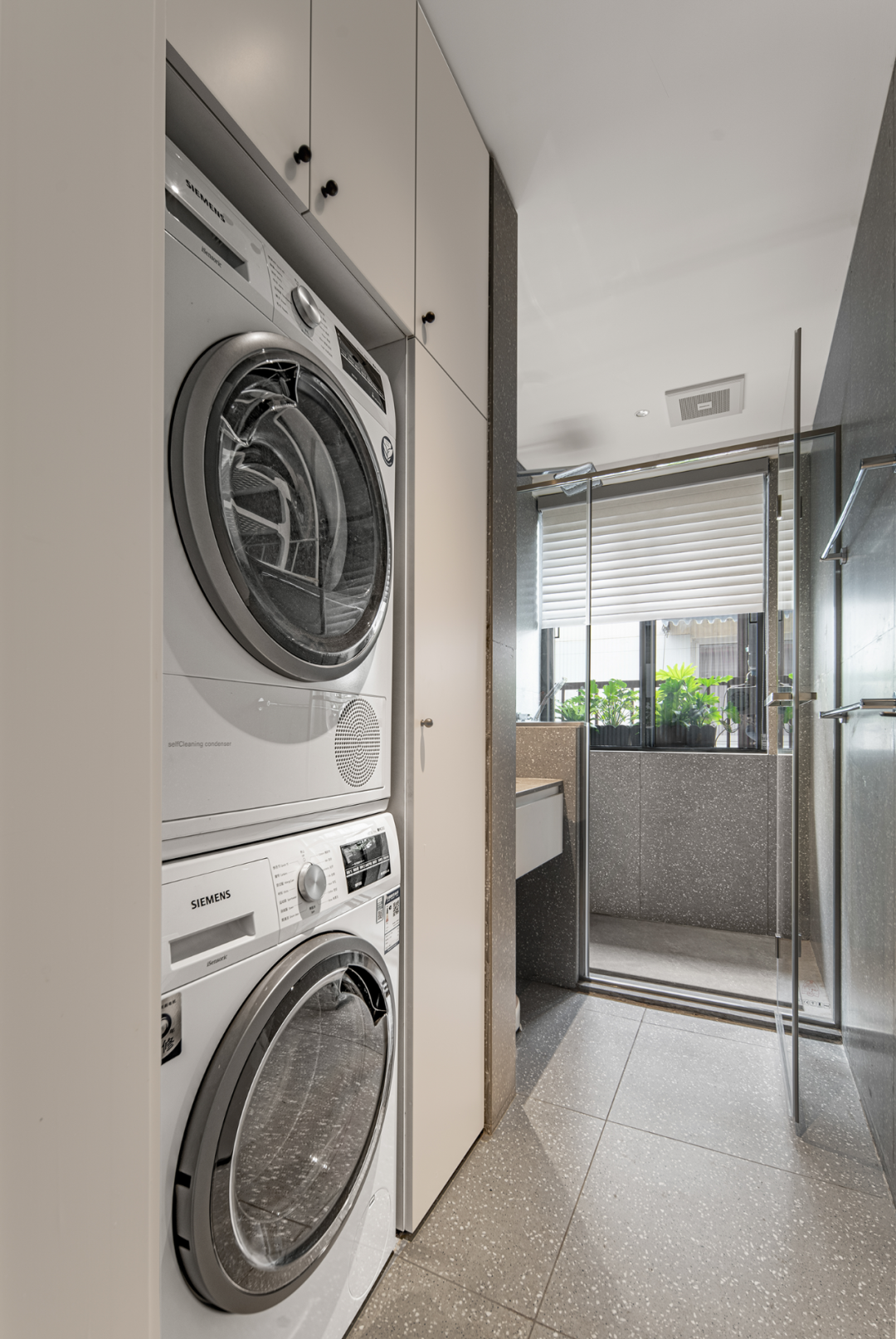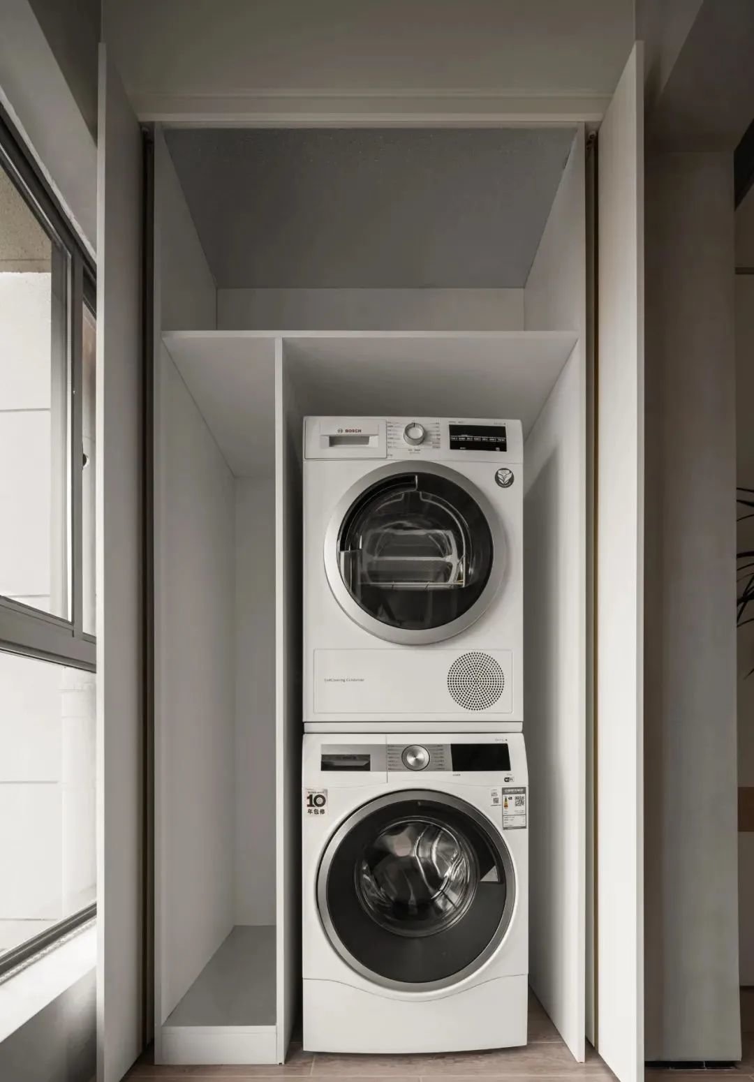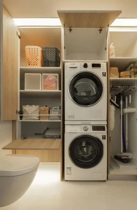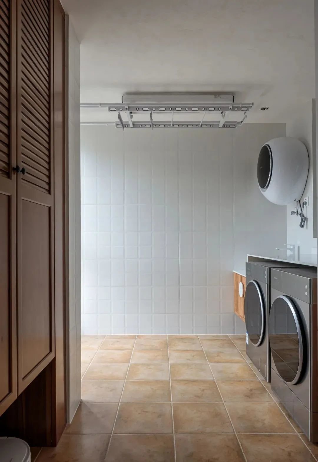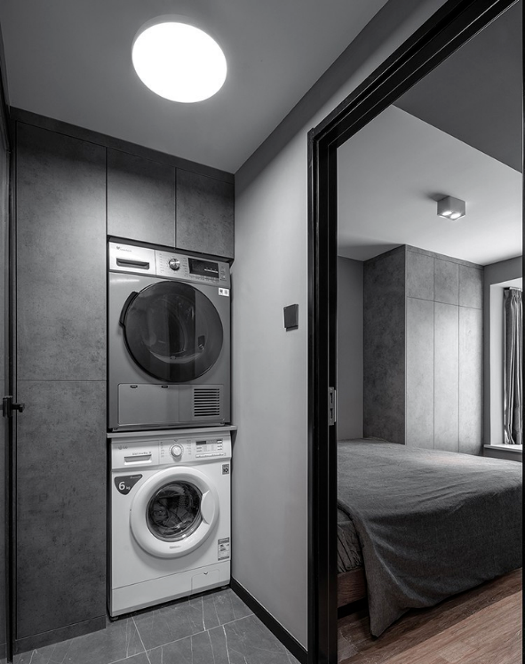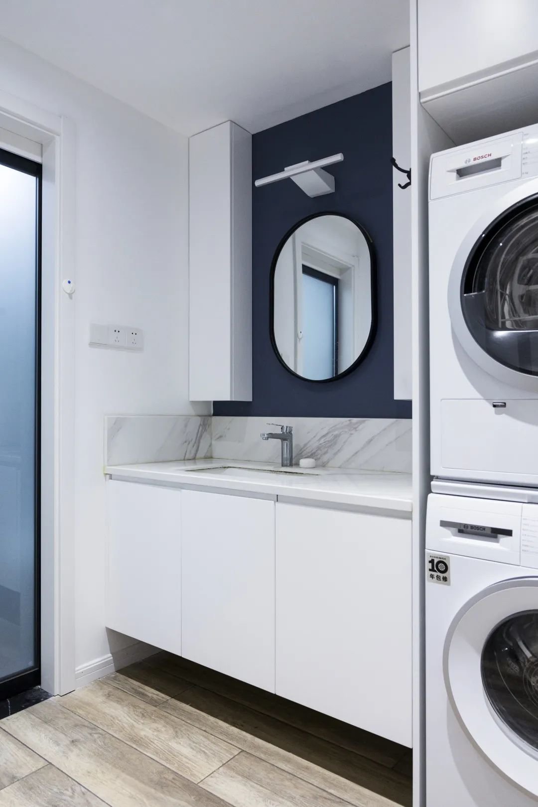 需要注意的是,洗衣机、烘干机等家用电器放在卫生间里,时间久了会有潮气影响,要做好干湿分离。如果是卫生间做三分离的家庭,那就没有这个烦恼啦~