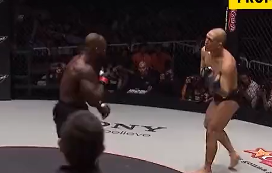 但意外也就在这时出现了,对手一个大幅度的下潜抱摔黑人壮汉抓住时机,一记勾拳直接将对手KO,比赛瞬间结束。