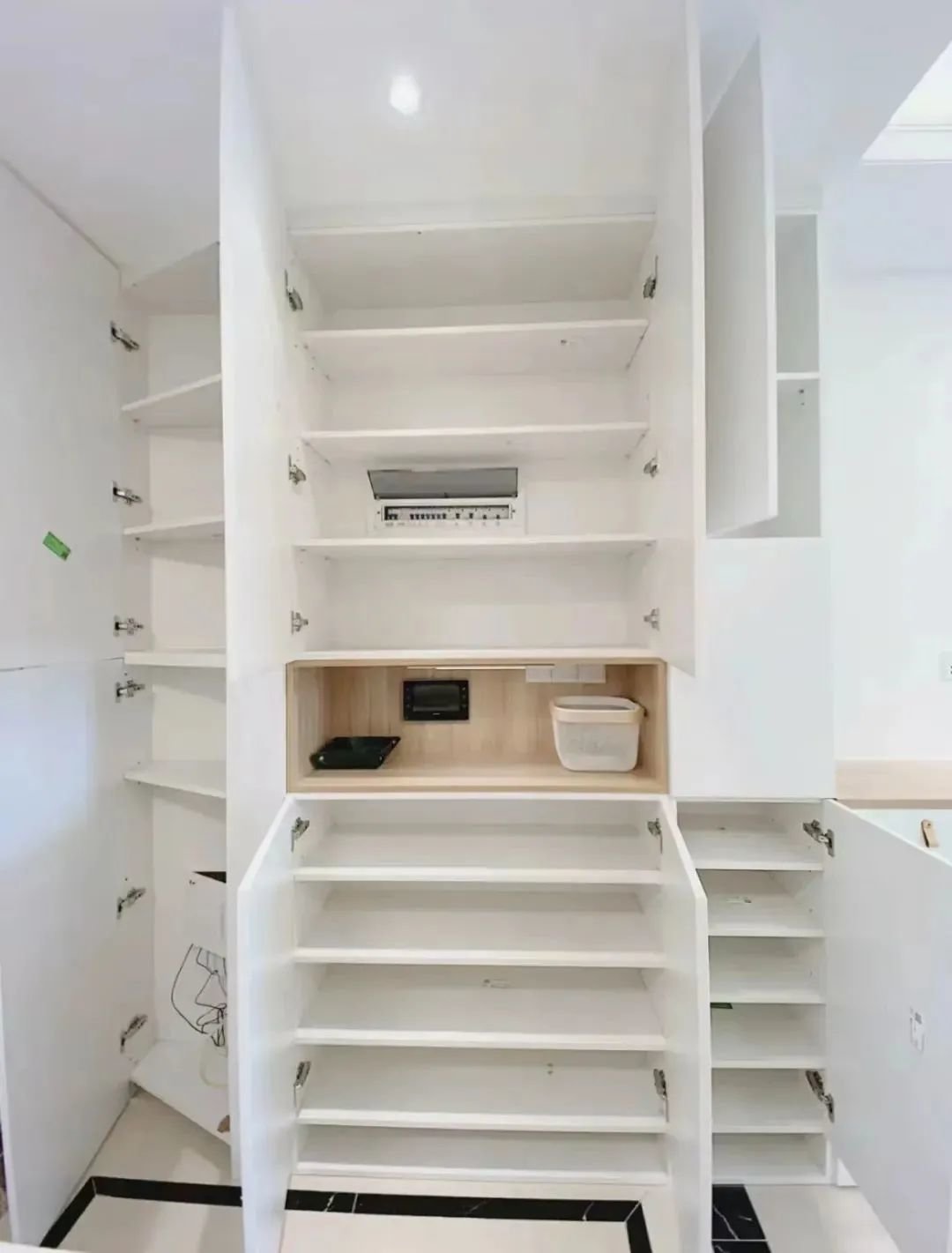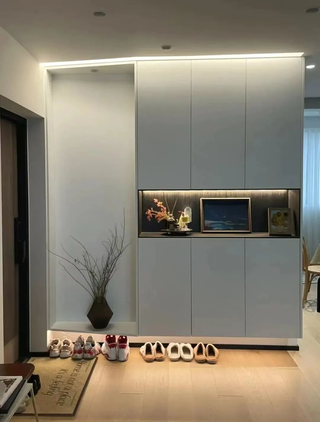 对于开门见厅的户型来说,比较适合做镂空侧边柜,因为既可以收纳鞋子衣物,又不影响整体空间的颜值。