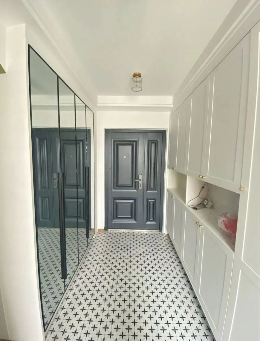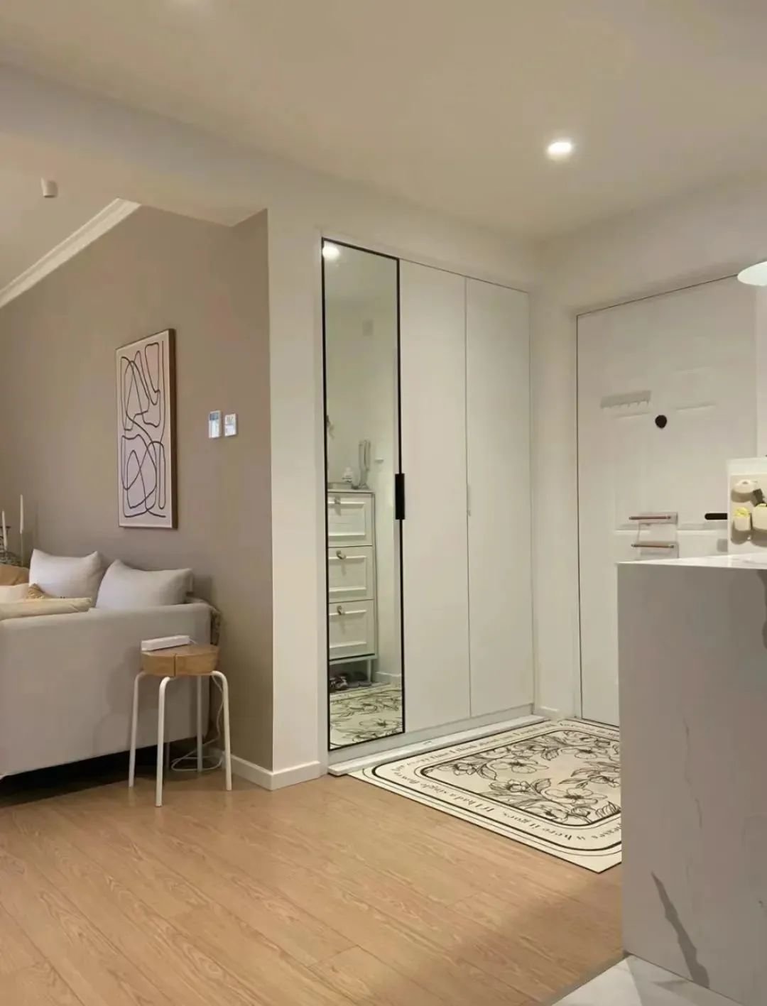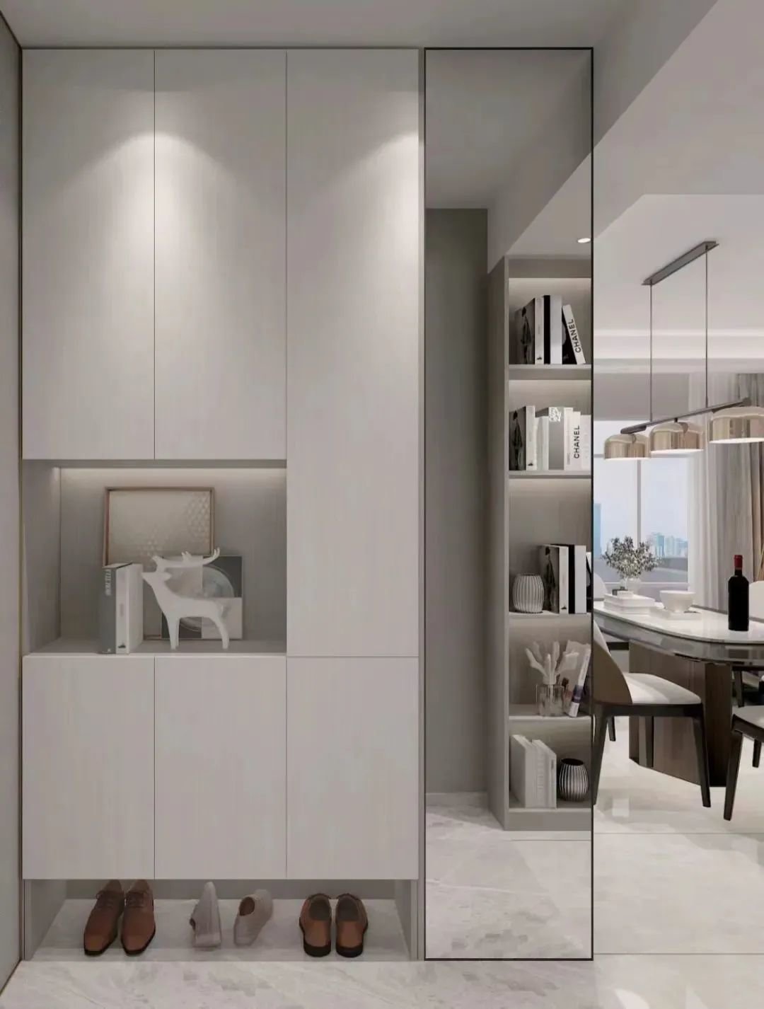 如果家庭成员比较多,可以做镜面玄关柜,考虑到成员多衣物自然也多的问题,可以将玄关柜的一部分空间打造成衣柜,解决储物需求。