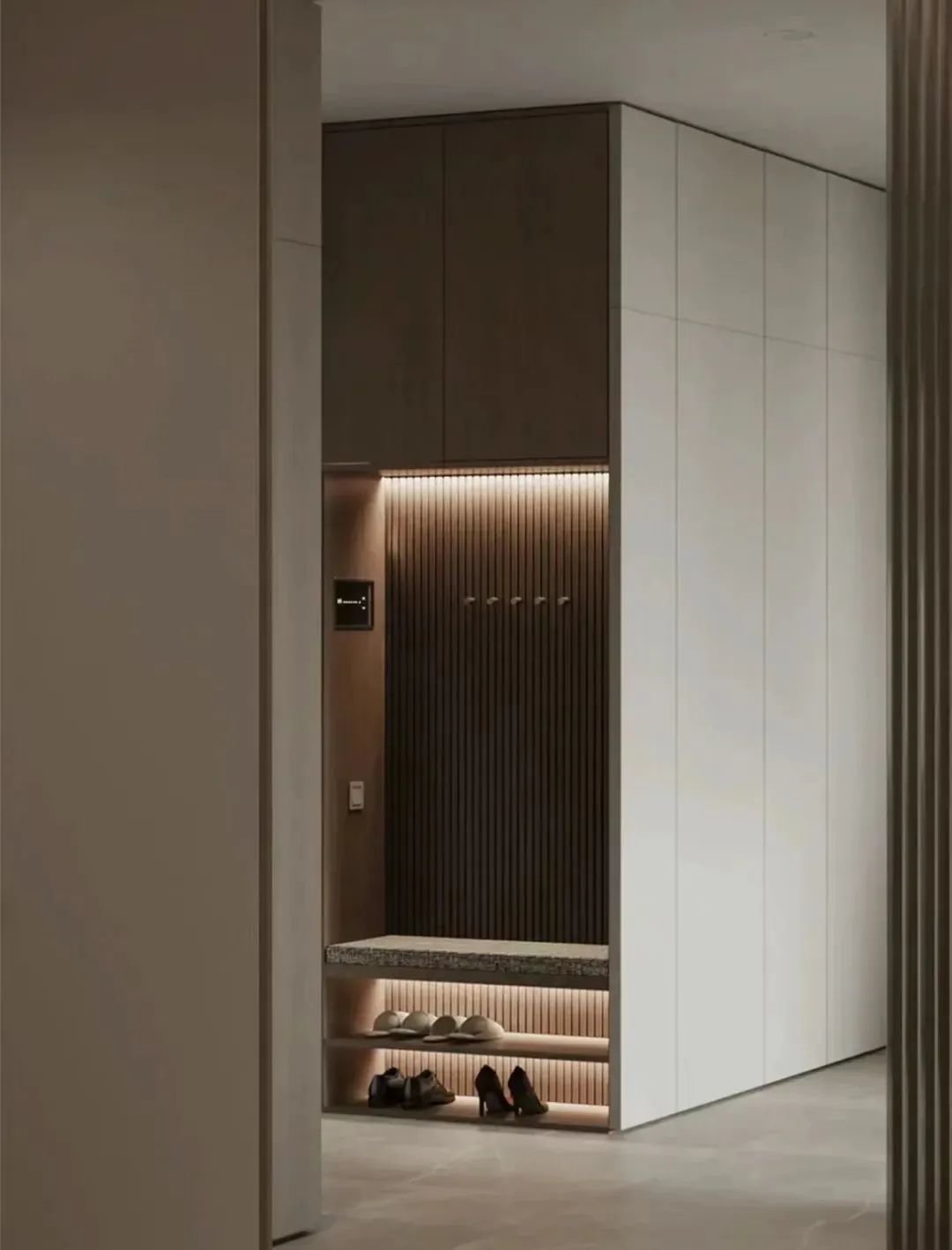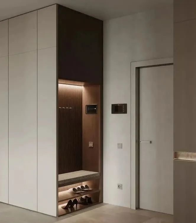 侧边柜内侧设计成挂衣区,下方空间做层板,摆放常穿的鞋子,并融入坐垫,方便换鞋。