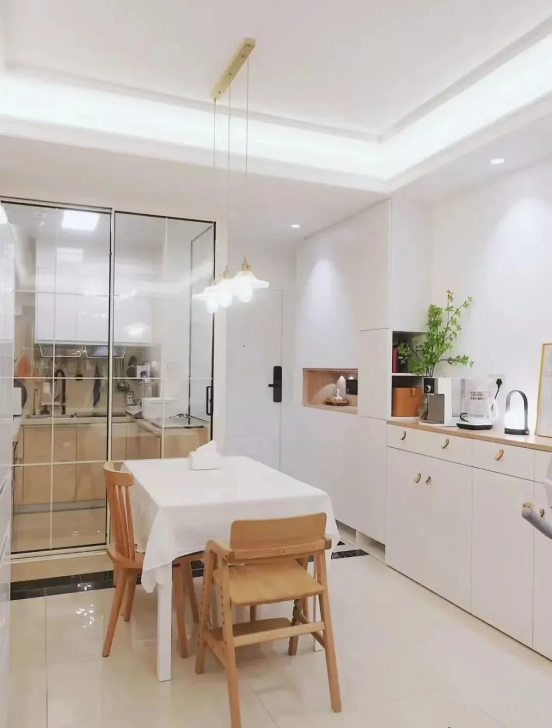 玄关柜还可以延伸做餐边柜,用来摆放茶壶等小家电,缓解厨房的收纳压力。