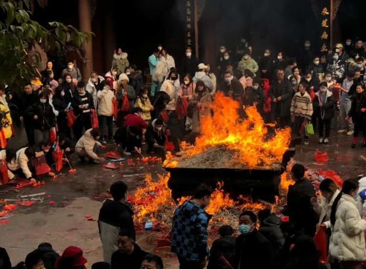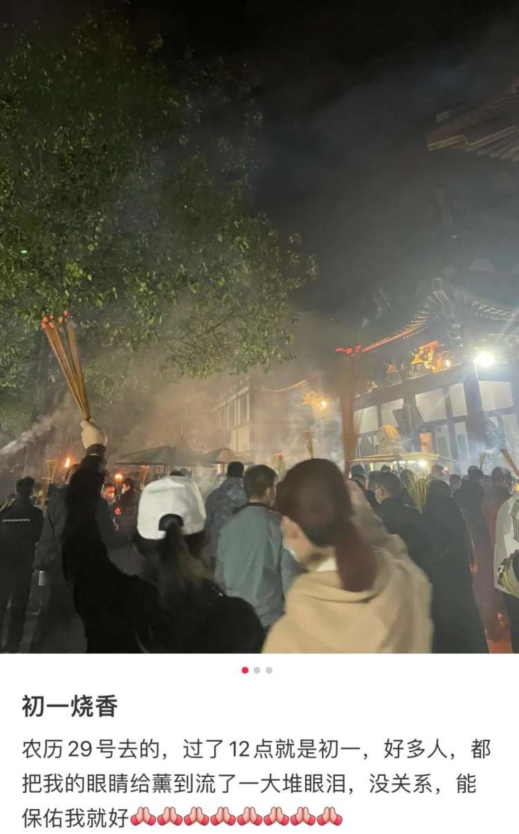除了被戏称为“北京伤心打工人收容所”的雍和宫,初一当天,其他各个省市本地的寺庙也挤满了早起烧头香的年轻人。