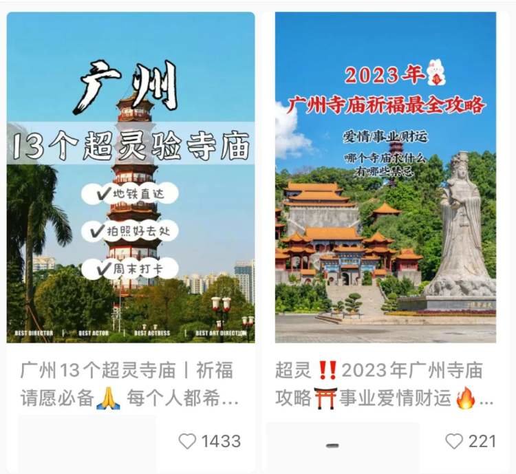 在祈福一事上,年轻人显得更懂得利用大数据,也更讲究效率。比起像老人一样直奔本地大寺,他们更倾向于先在某书上搜索“××市 寺庙”,从而得到一份完整的当地祈福指南。