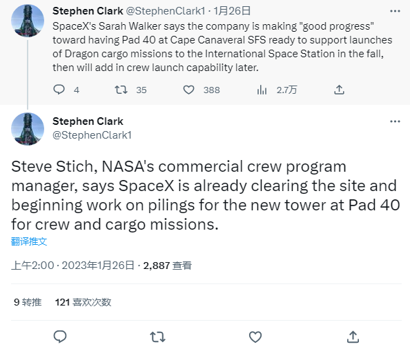 NASA 商业乘员项目经理史蒂夫・斯蒂奇 (Steve Stich) 表示,SpaceX 已经在清理场地,并开始为 Pad 40 的新塔进行打桩工作,用于载人和货运任务。