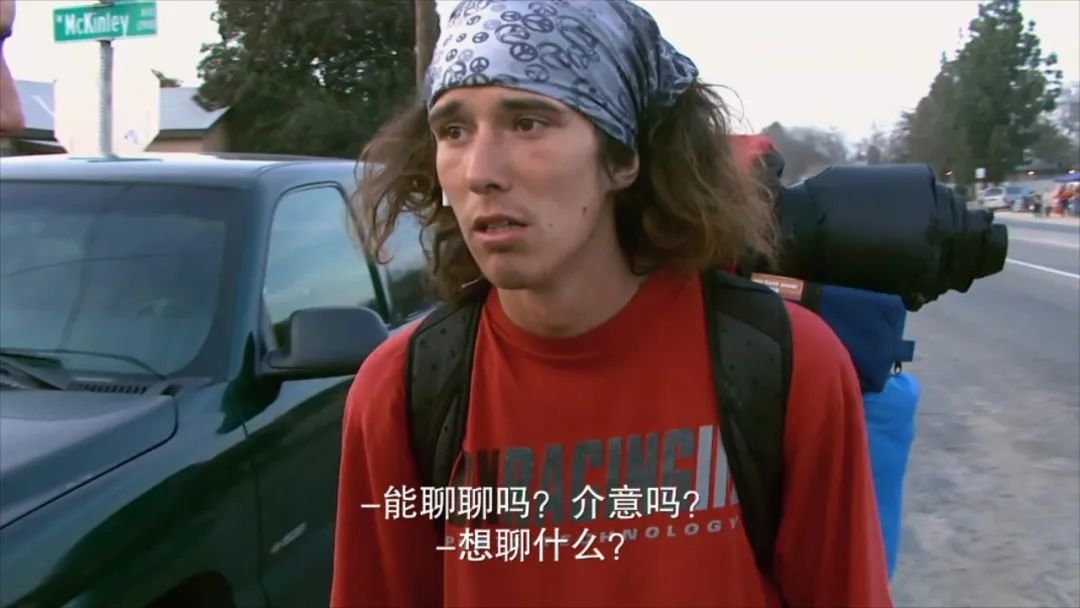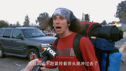 斧头男顶着一个爆炸头,身上脏兮兮的,背上都是行李和铺盖。