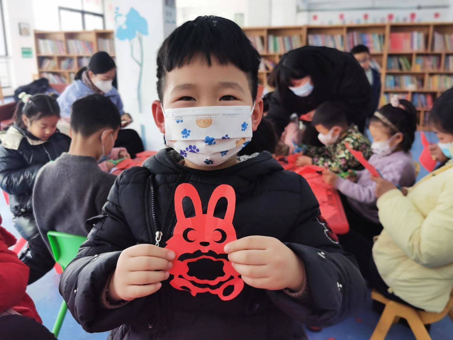 三年级的壮壮第一次学习剪纸,捧着自己的作品,怀揣着对新一年幸福生活的美好祝福和期盼,他说:“看老师剪的时候感觉很简单,刷刷两下就剪完了,但是轮到自己剪的时候发现特别不容易,剪完后,看到这个可爱的小兔子觉得很有成就感,剪纸可以锻炼我们的动手能力,是一次很特别的体验。”