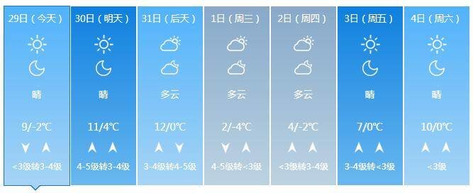 30日夜间到31日白天,全省天气晴转多云。南风转北风,半岛地区4~5级阵风6级,其他地区3~4级。最低气温:鲁西北、鲁中山区和半岛内陆地区-3℃左右,其他地区-1℃左右。最高气温:鲁西北、鲁中山区和半岛地区10℃左右,菏泽和潍坊西部14℃左右,其他地区12℃左右。