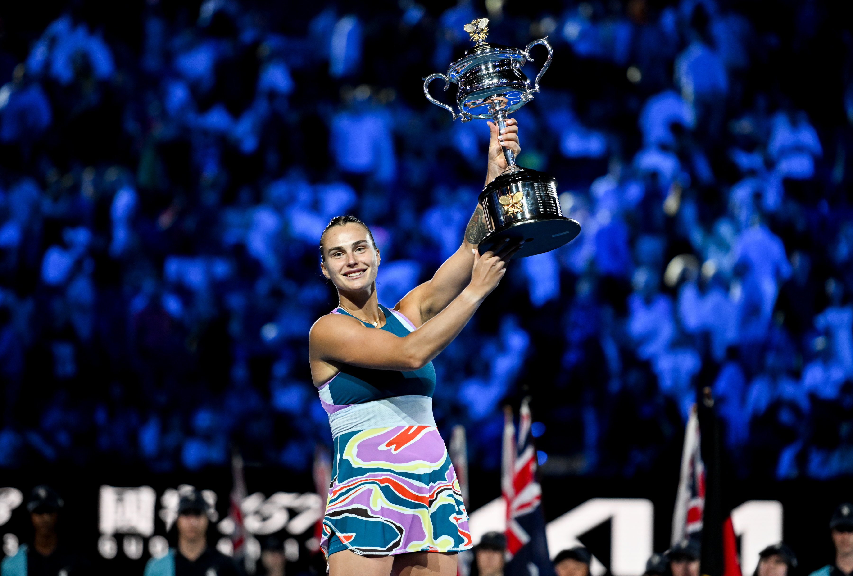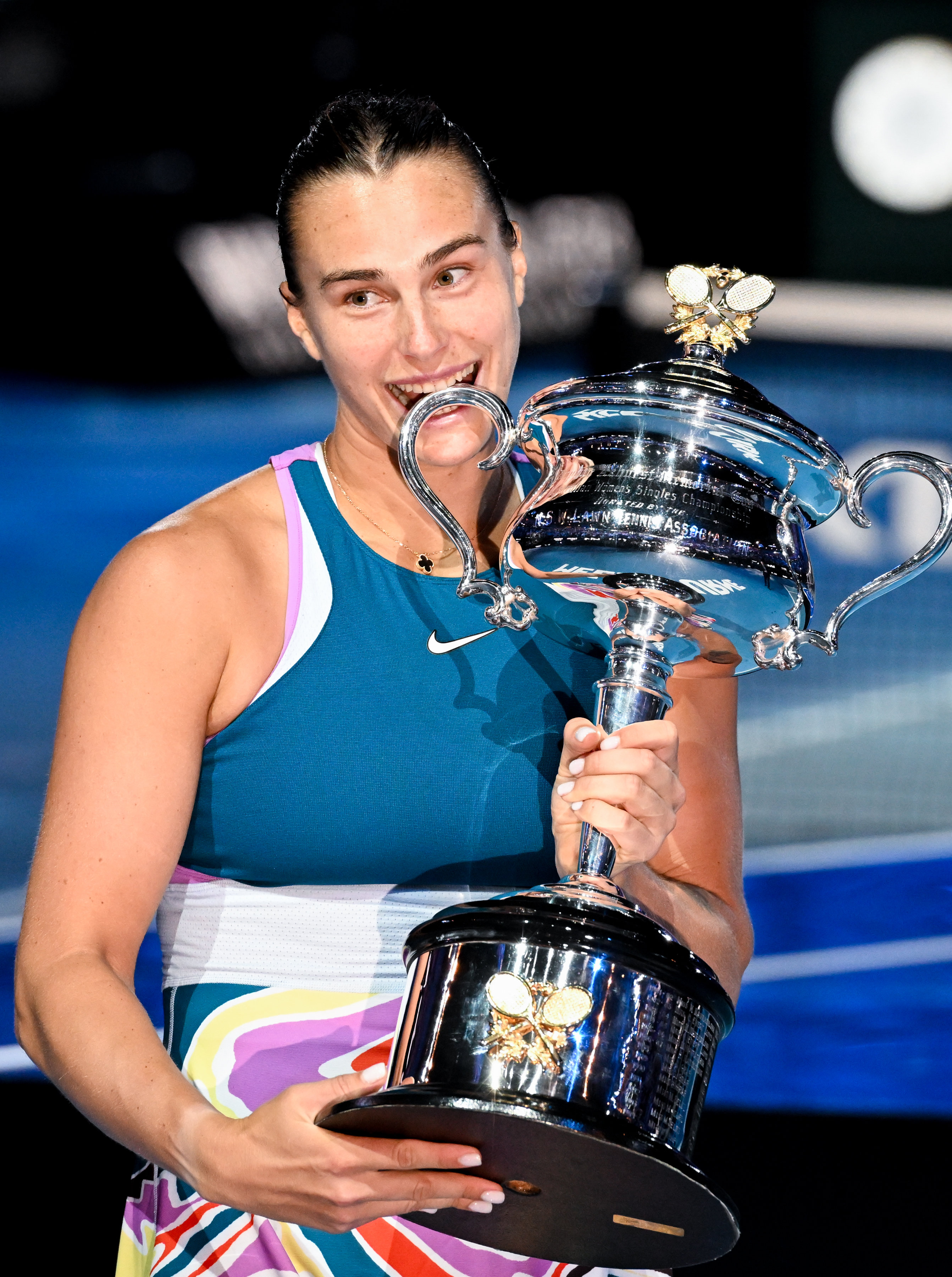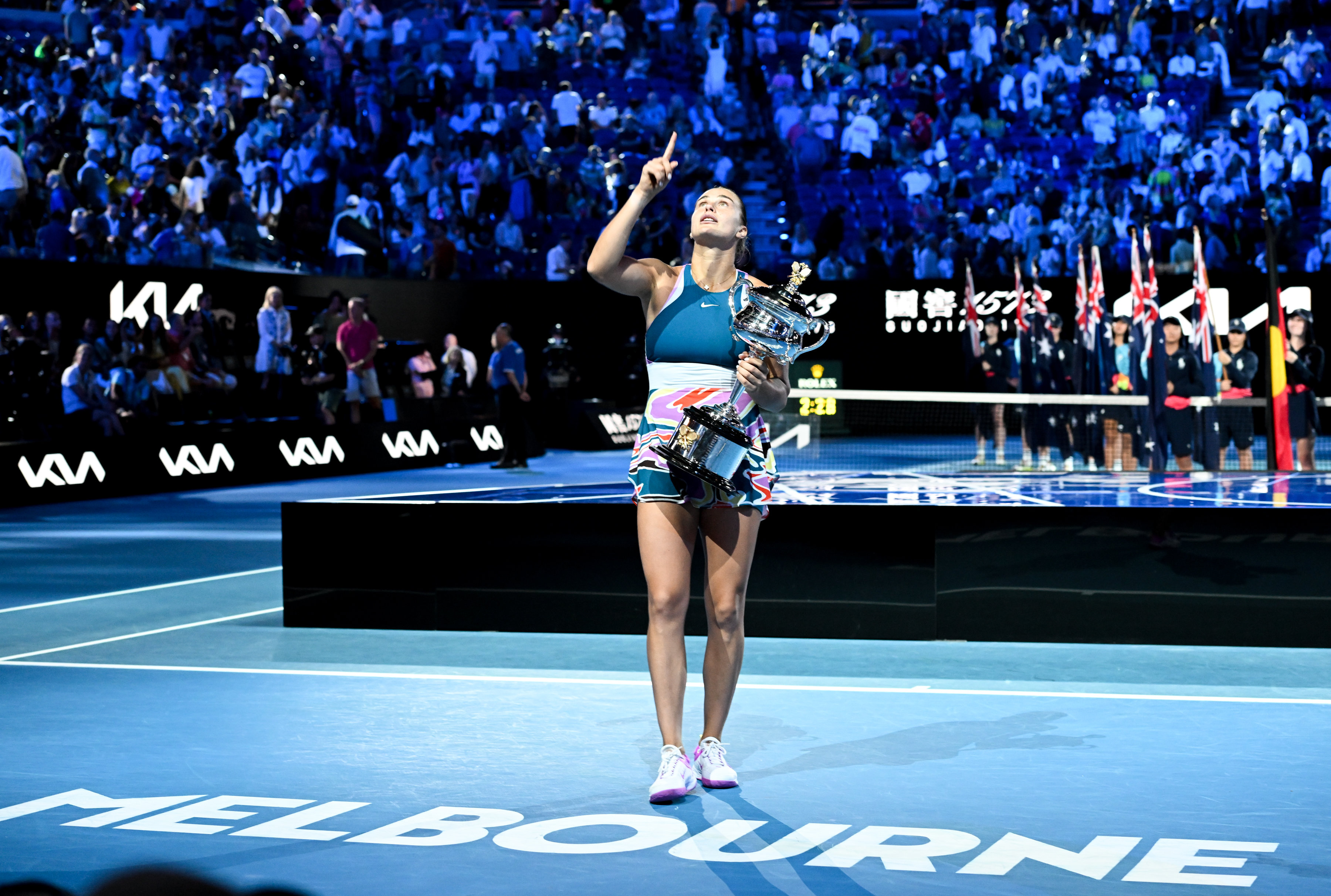 1月28日,萨巴伦卡在颁奖仪式上庆祝夺冠。新华社发(胡泾辰摄)