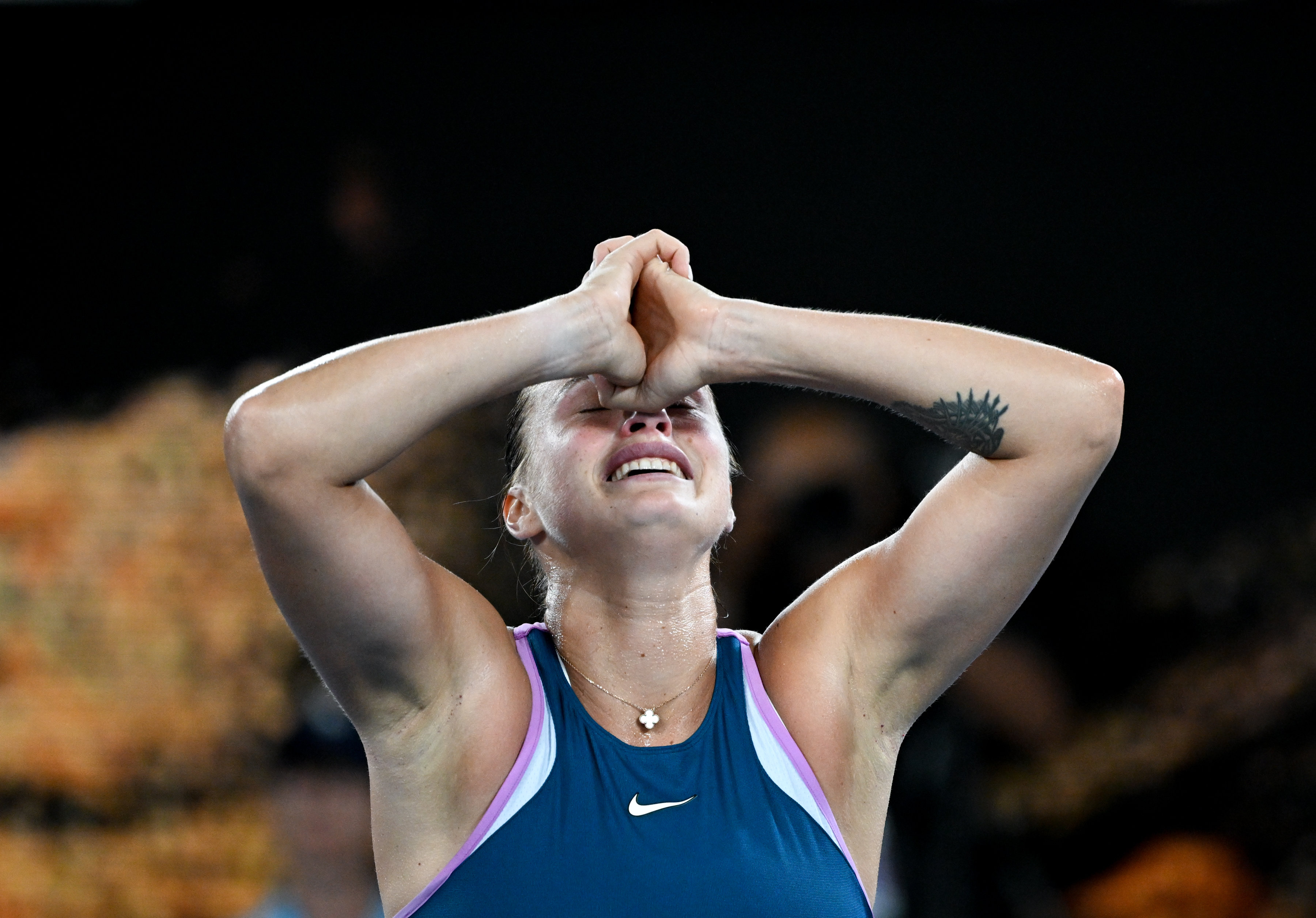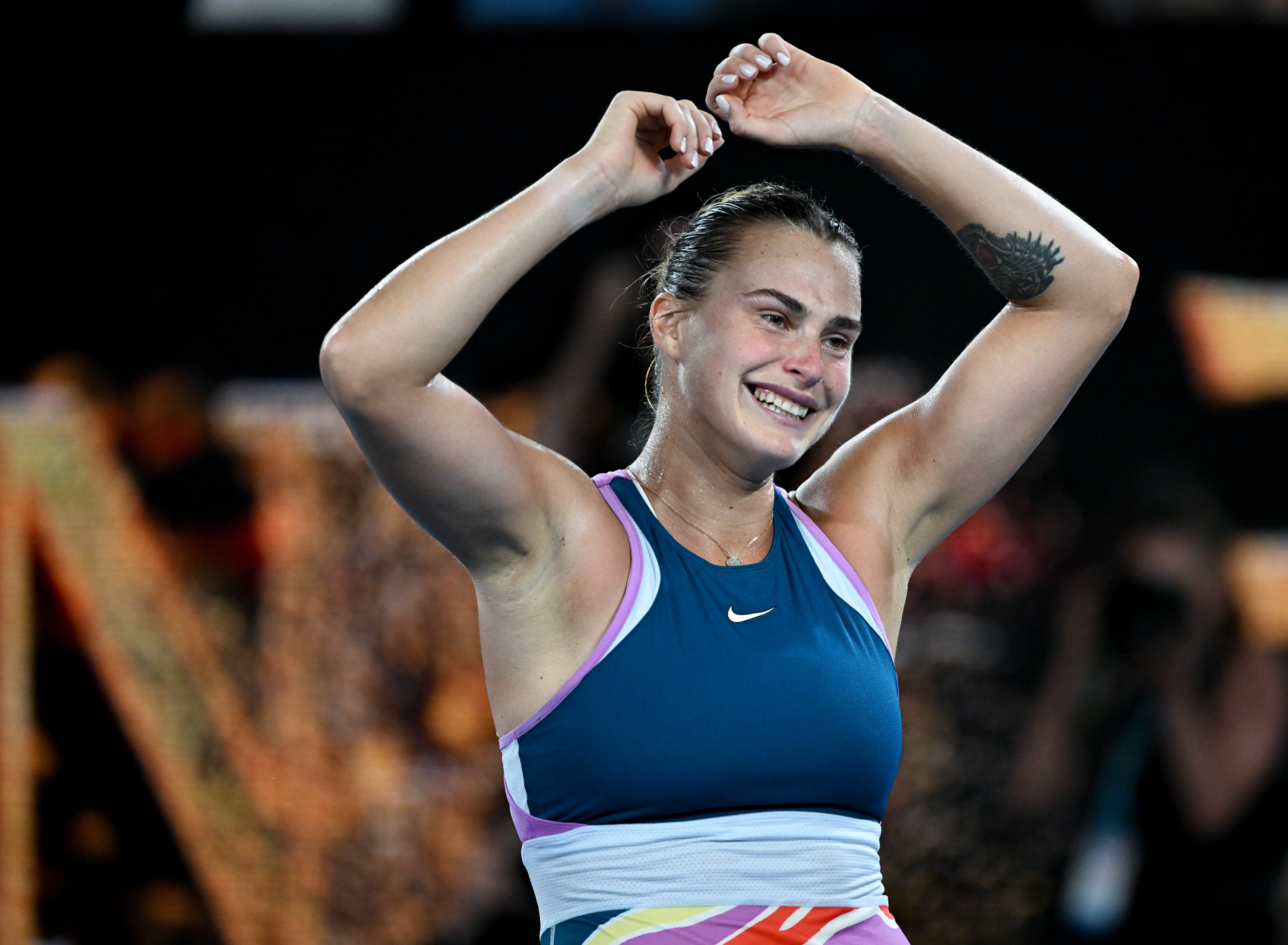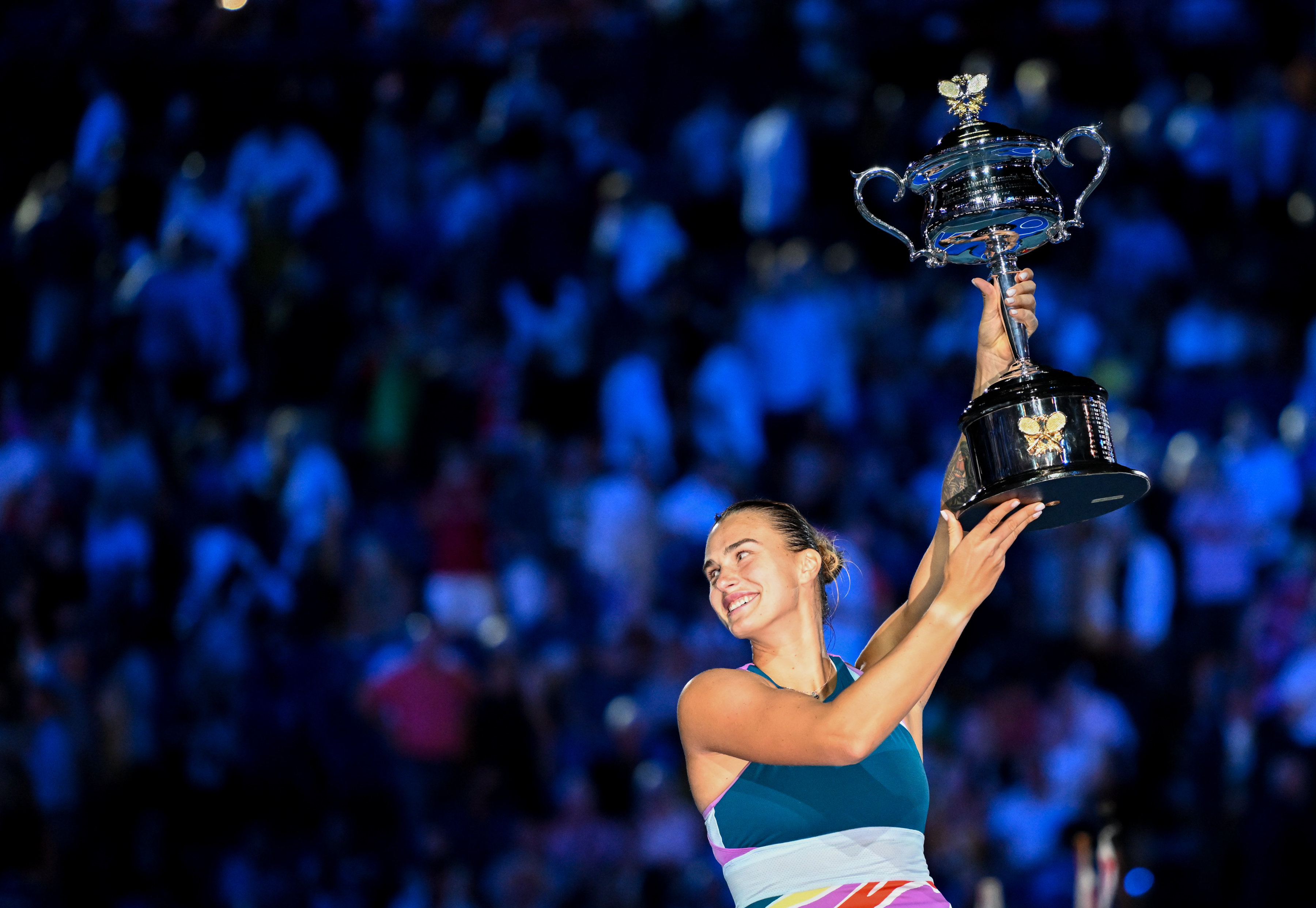 1月28日,萨巴伦卡在颁奖仪式上庆祝夺冠。新华社发(胡泾辰摄)