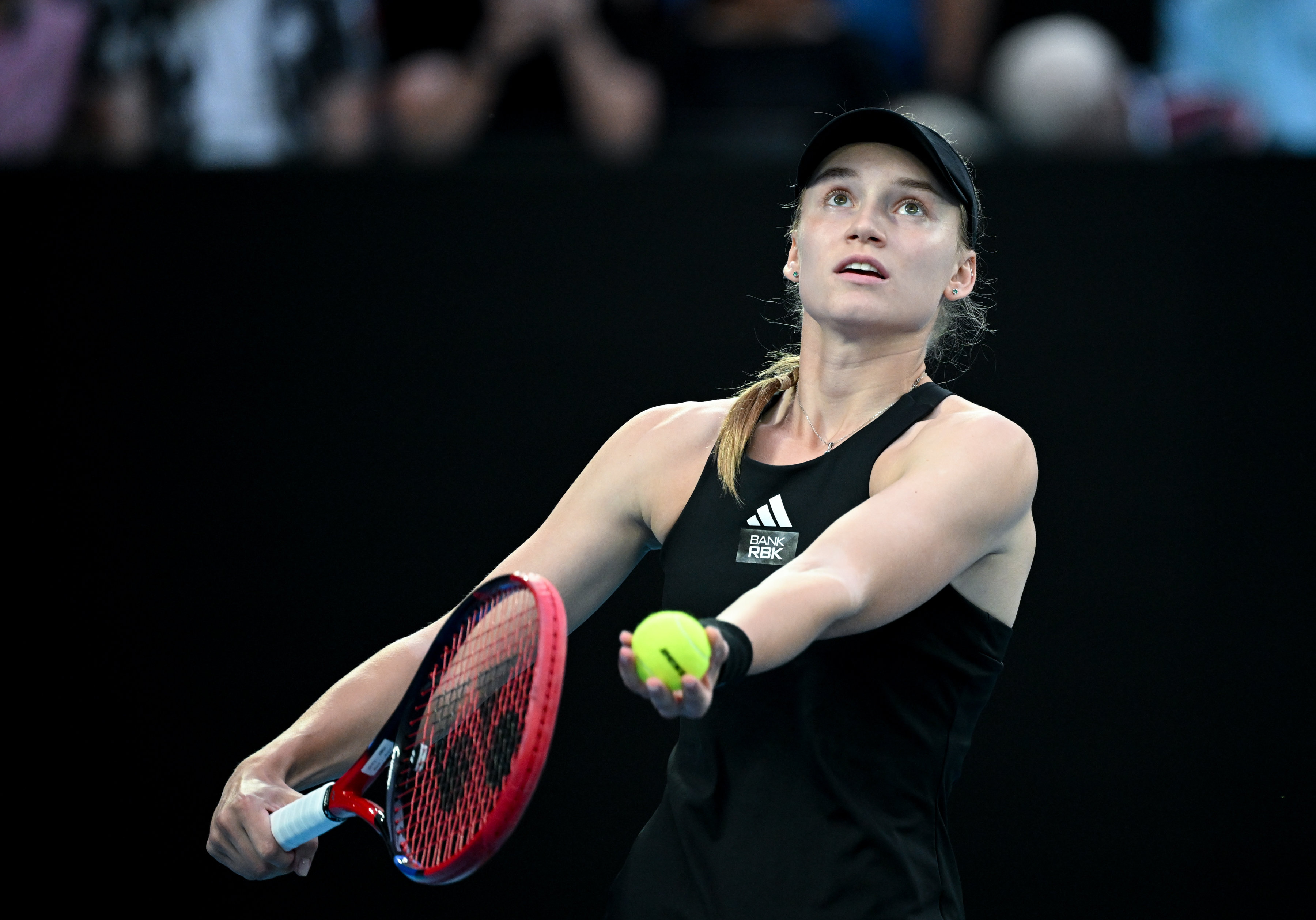 1月28日,莱巴金娜在比赛中准备发球。新华社记者 郭磊 摄