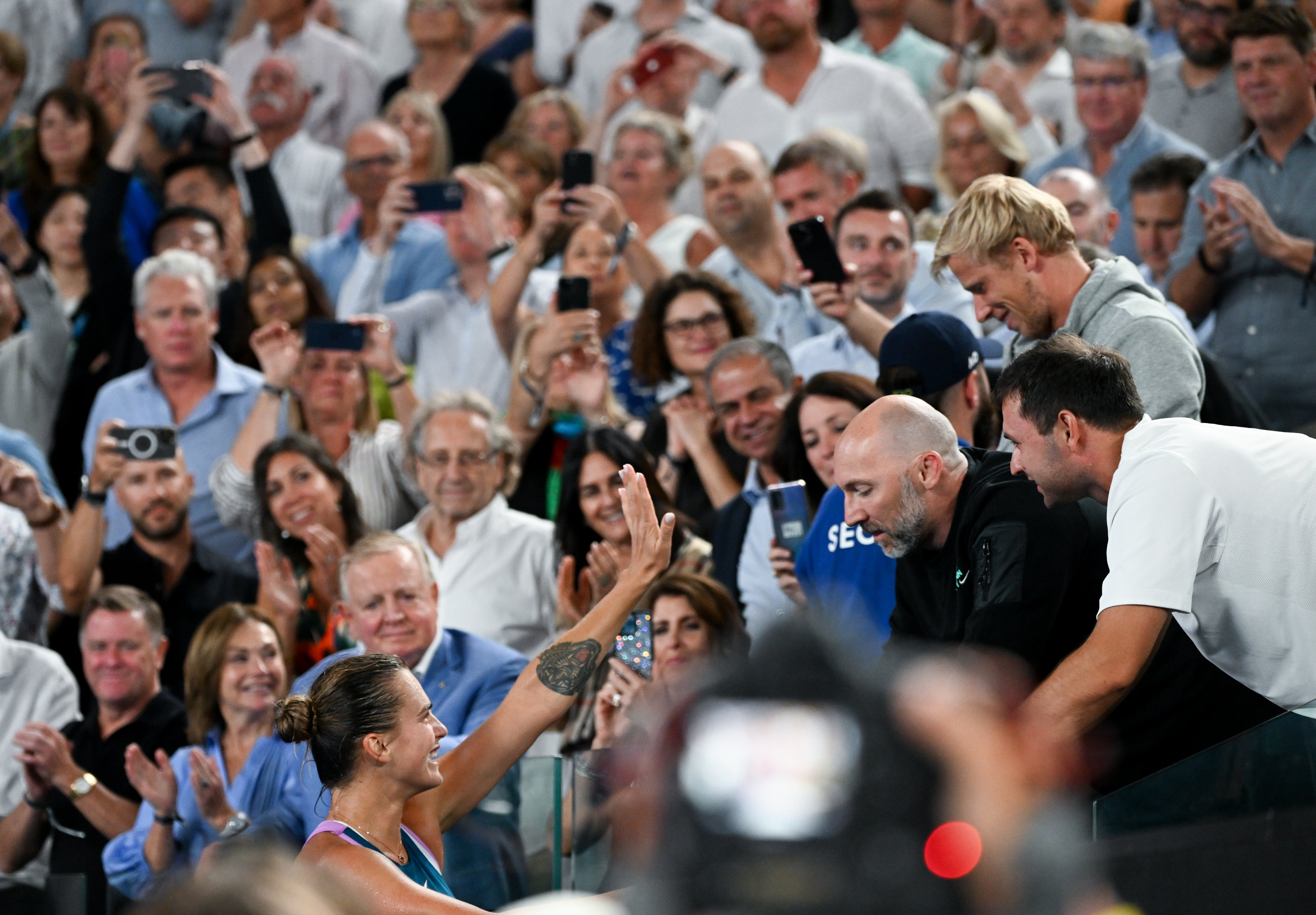 1月28日,萨巴伦卡赛后庆祝夺冠。新华社记者 郭磊 摄
