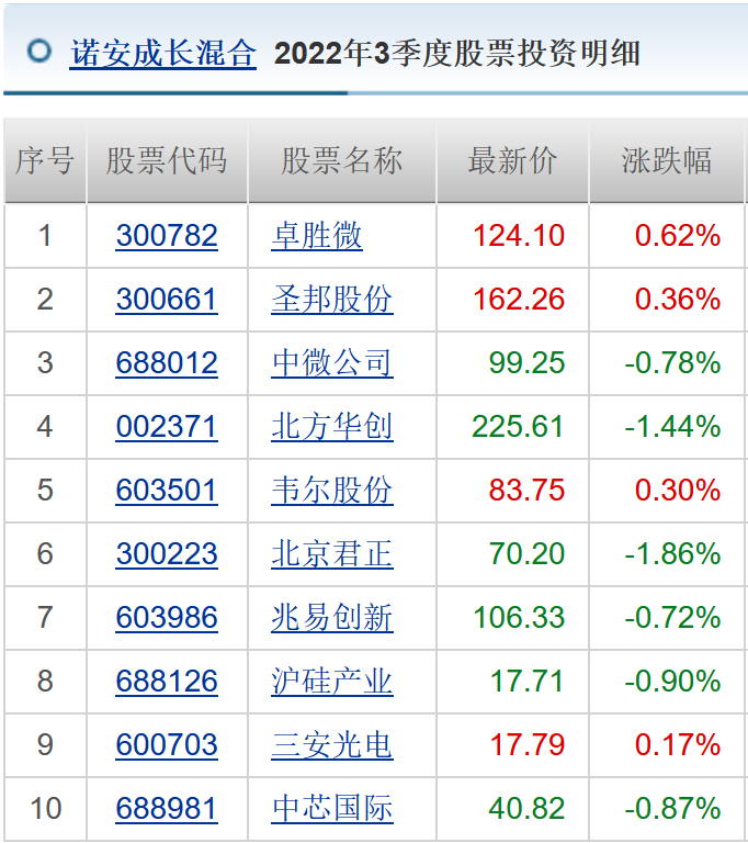 翻开诺安成长混合的持仓,可以清楚地看到,前十大重仓股,清一色的半导体芯片个股,一只混合型基金买成了半导体指数基金。