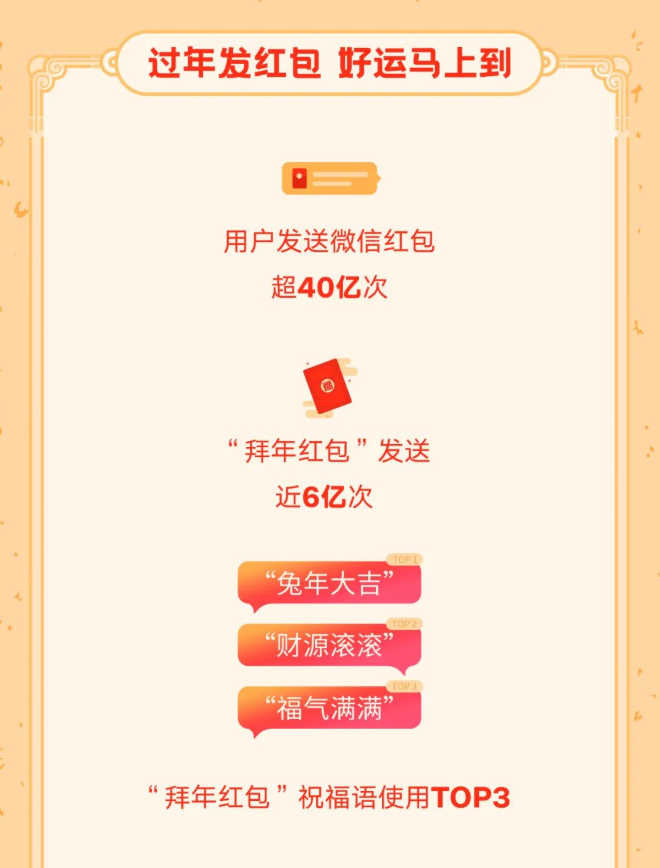 此外,报告还显示,兔年大吉、财源滚滚、福气满满是“拜年红包”祝福语使用TOP3。动态红包封面领取超3800万次。春节联欢晚会竖屏直播,有超1.9亿人观看,点赞喝彩超3.79亿次。