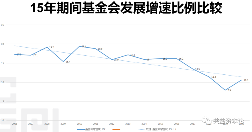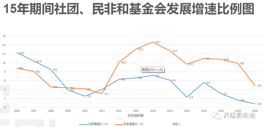 从上图可以看出,基金会、社团、民非的增速均在2008后的数年间出现一个小高潮,基金会的增速峰值是在2010年,而社团与民非则出现在2014年。