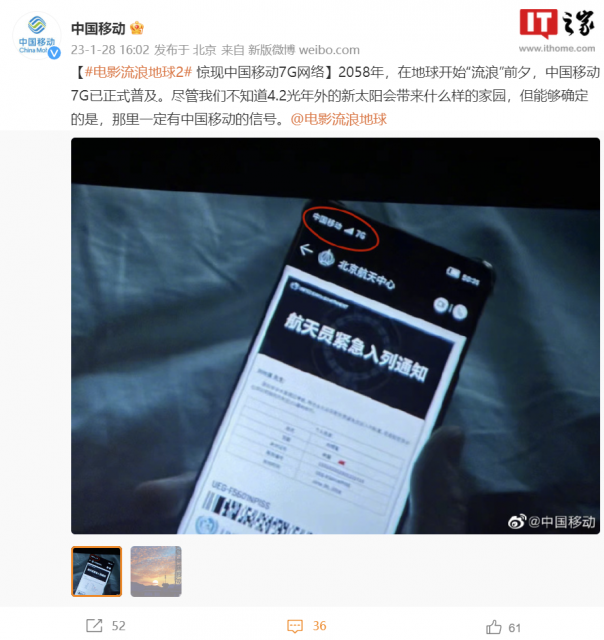 根据中国移动官方晒出的《流浪地球 2》剧照,影片中接收航天员紧急入列通知信息的手机采用的是中国移动 7G 网络。