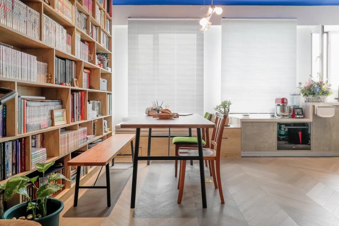多功能餐厅,承包了书房、餐厅、临时居住区集于一体。一整面墙做了书柜,开放式的格子架放书籍,完全满足业主的藏书需求。
