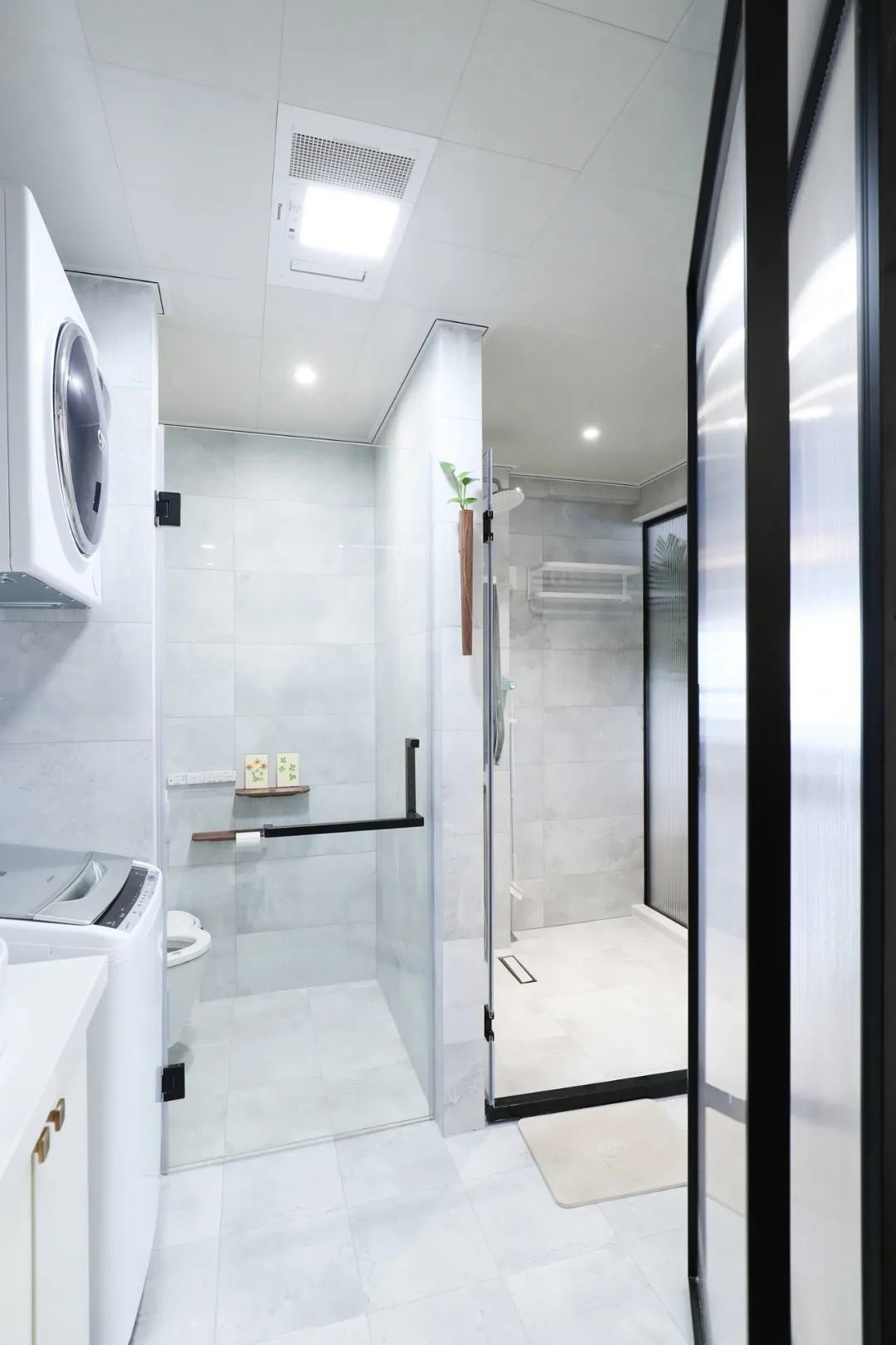 卫生间利用长虹玻璃代替墙面,将自然光引入室内,给予视觉上的扩大,不会显得小而压抑。