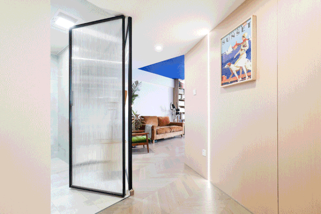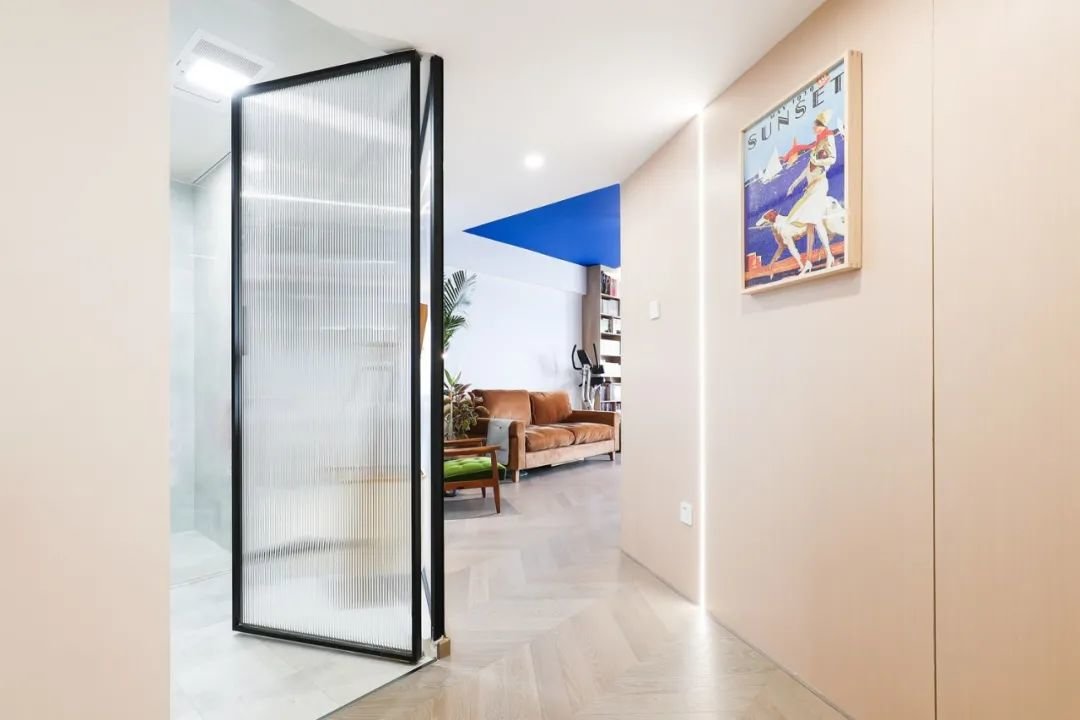 入户玄关呈几何形的长廊形式,长虹玻璃的利用,既确保了室内隐私性,也让空间更加通透明亮。