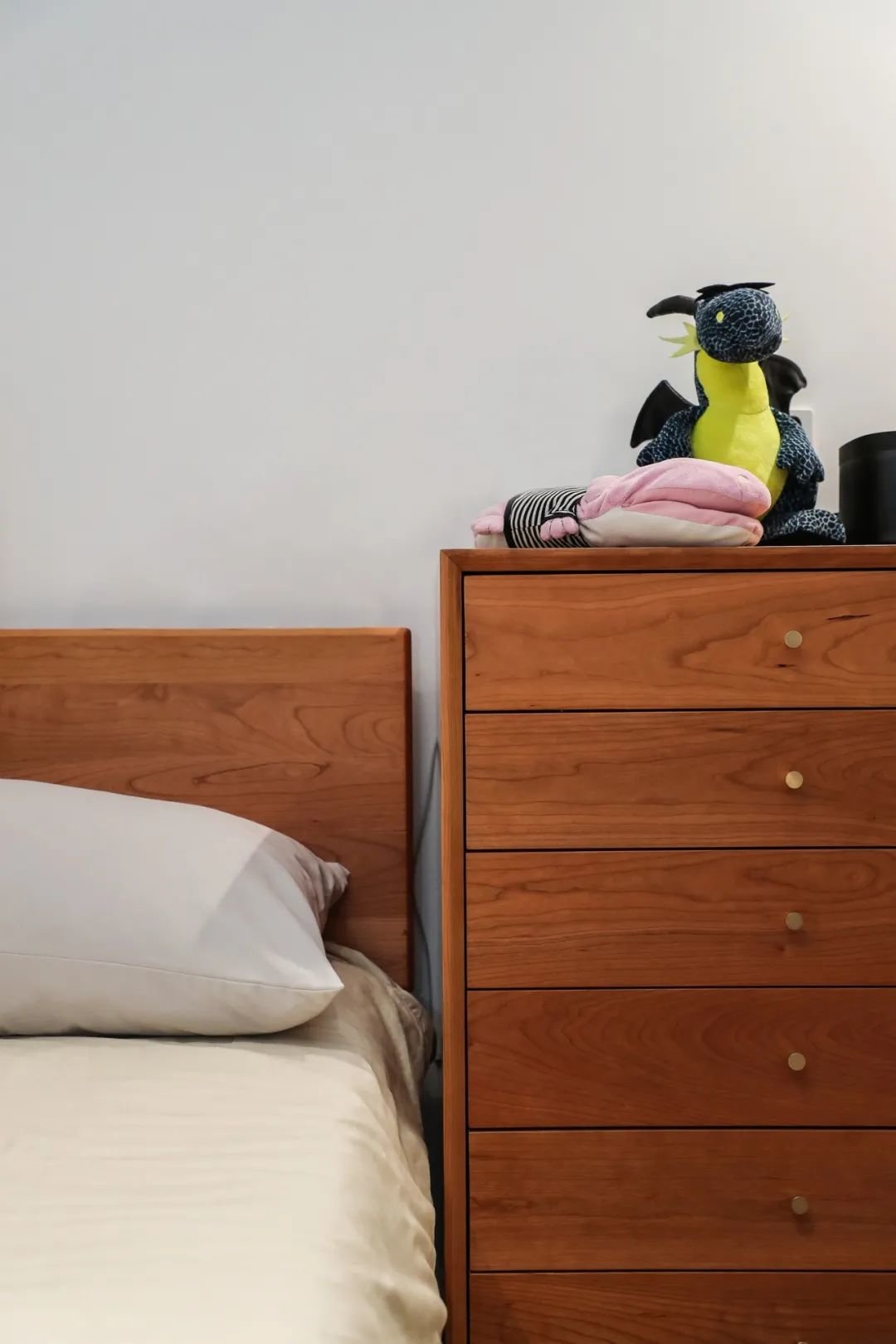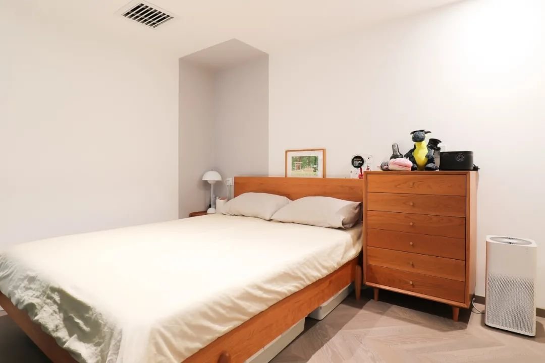 卧室以白色、樱桃木色为主,墙面做了分色处理,让墙面颜色富有变化而不单调,搭配樱桃木的主体床与五斗柜,温润又舒适。