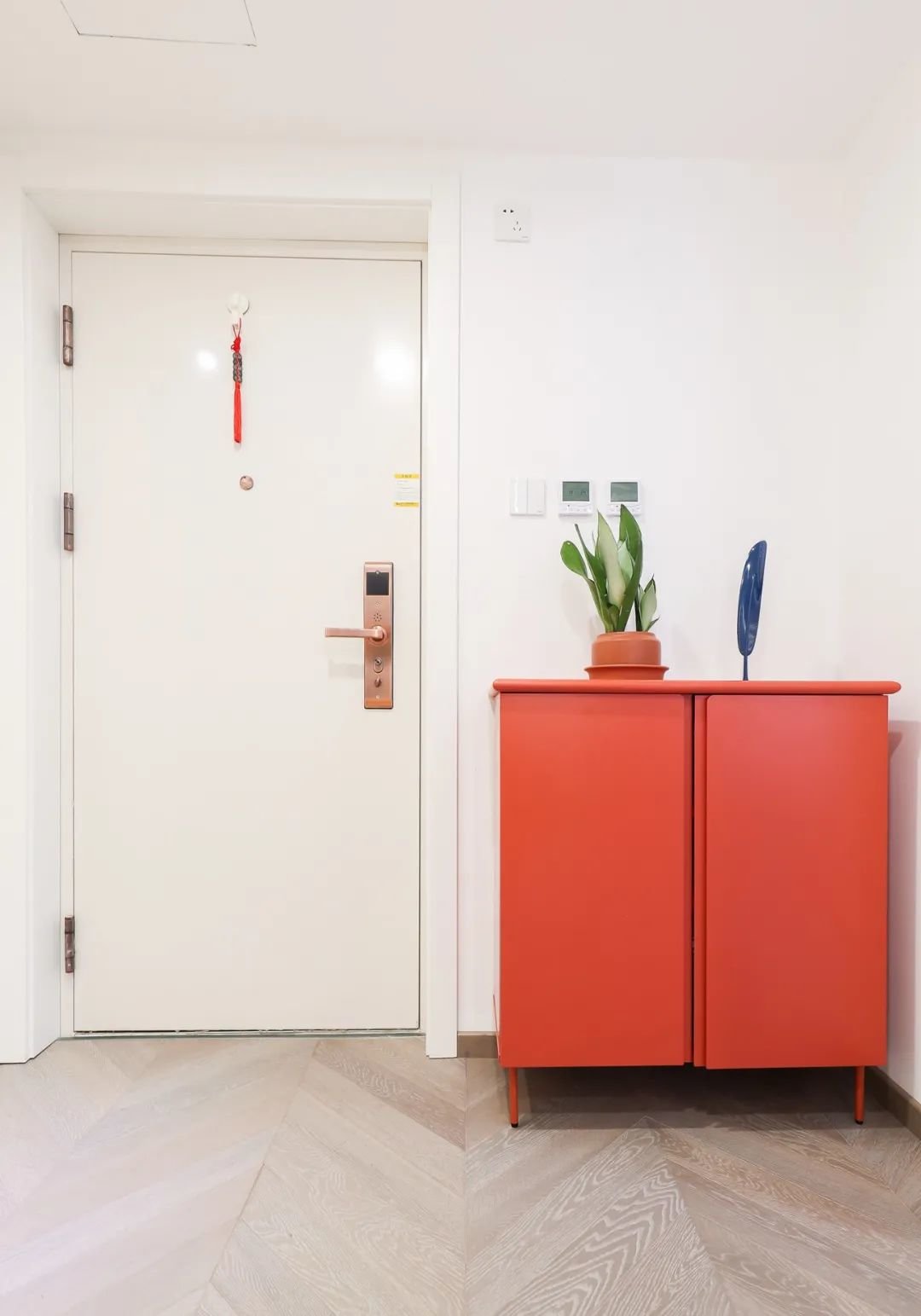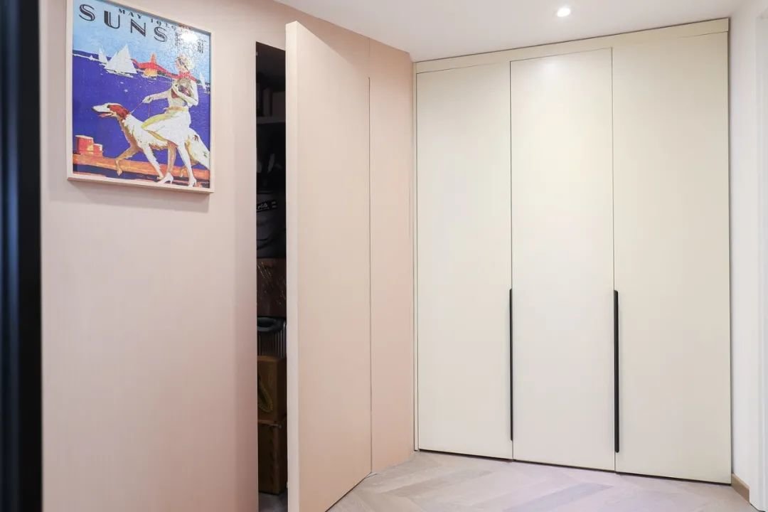 设计师利用斜角处做了储藏间,大大增加了收纳空间,洋红色的端景柜,彰显整个玄关的“热情和活力”。