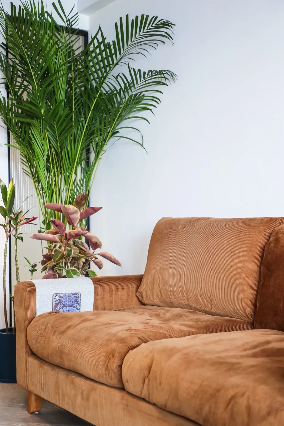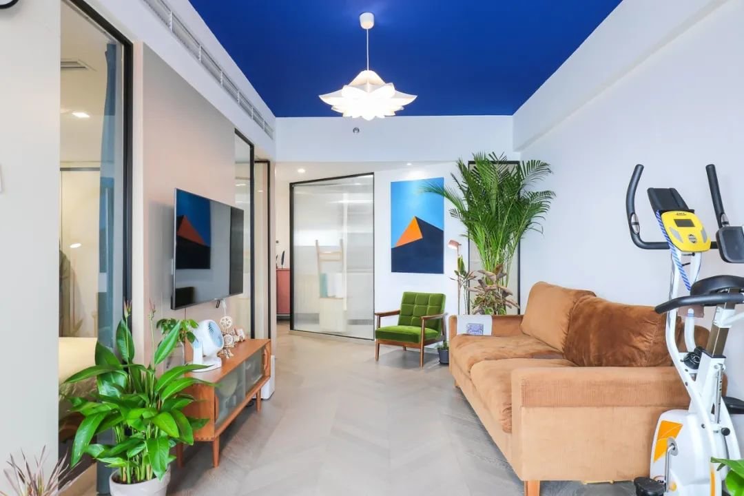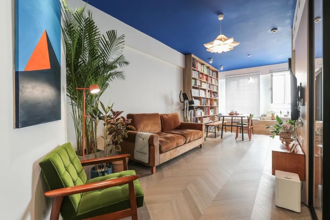 客厅,整体以暖色调为主,棕色布艺沙发+绿色沙发椅+蓝色天花板,温润安静又不失活力。