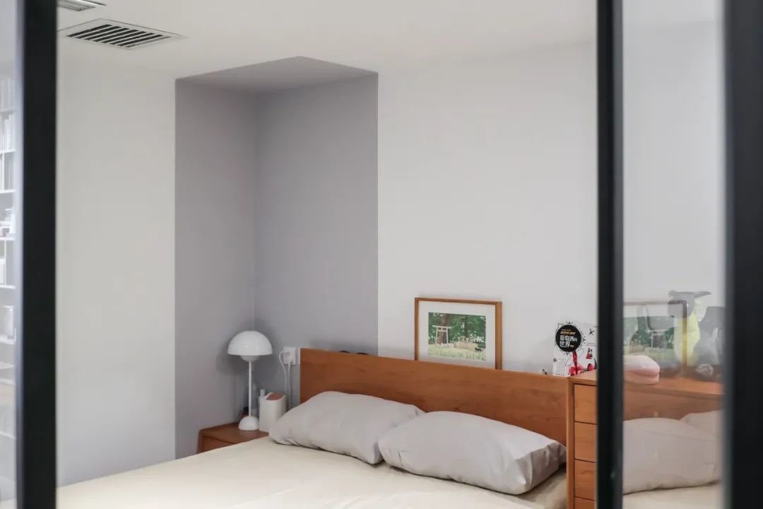 卧室,利用墙面和玻璃结合的形式,让空间避免压抑,显得通透明亮。