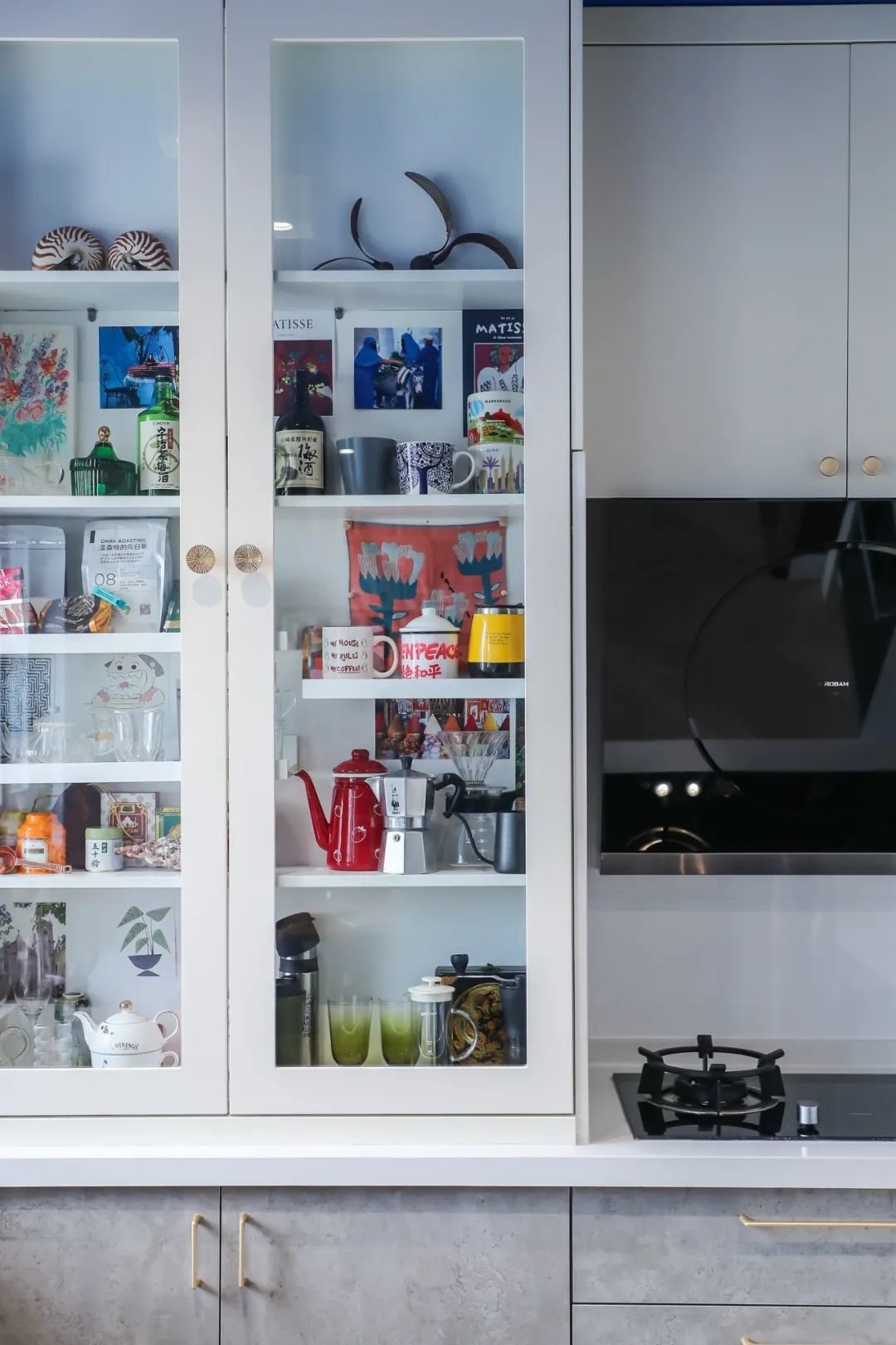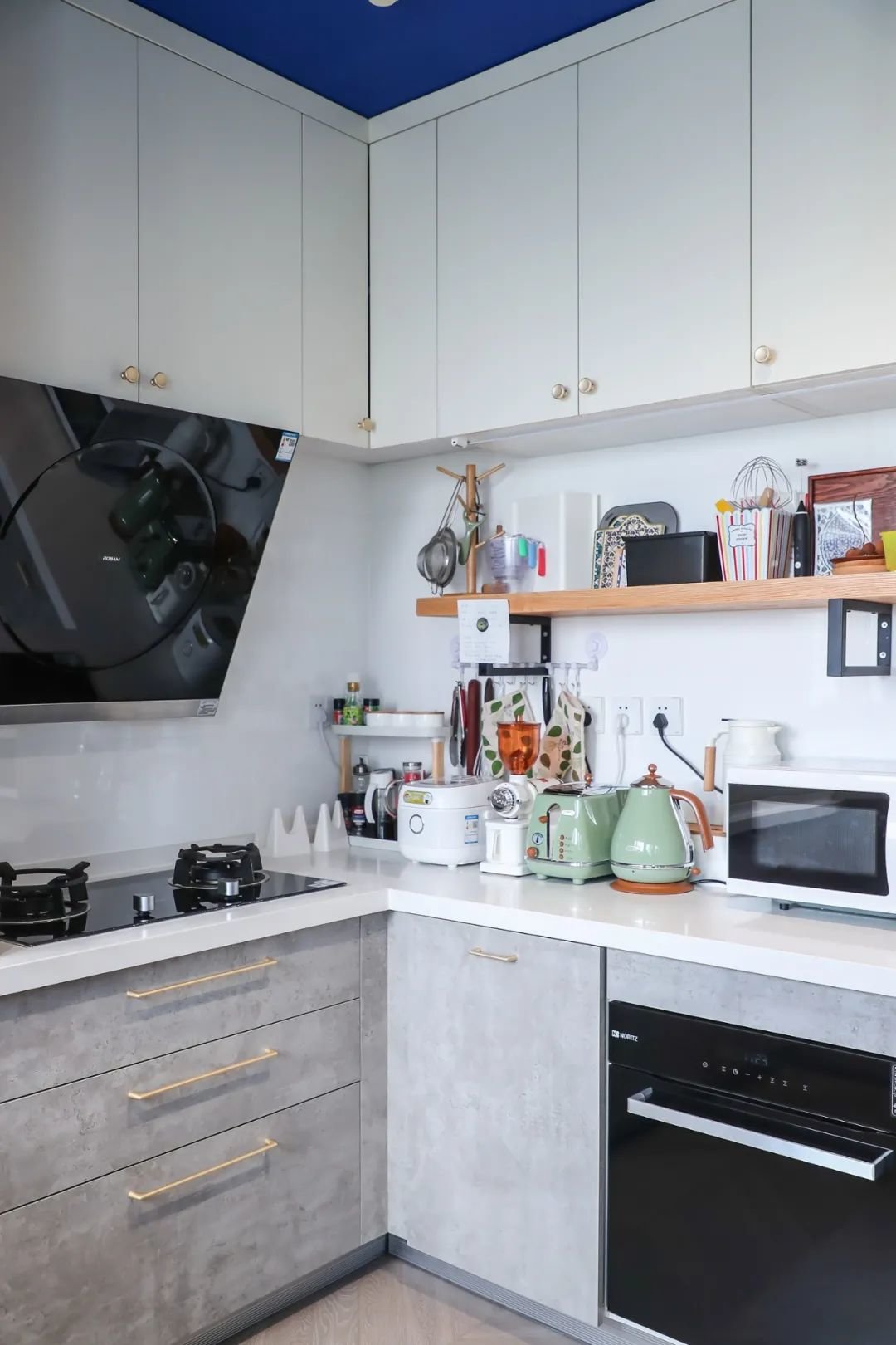家电做内嵌式处理,下厨动线流畅,充分利用空间。金色的复古把手,搭配烟灰色的柜体,精致高级。