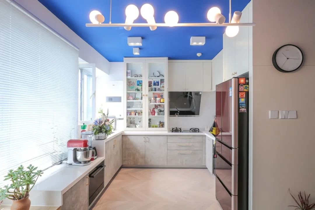 开放式的厨房设计,采用U型的橱柜布局,橱柜高低台的设计,让日常生活使用更舒适。