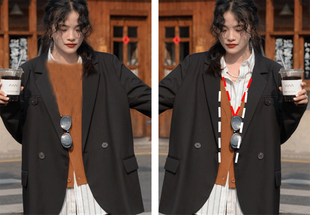 第一个就是马甲的领口,V领马甲可以修饰脖子线条,视觉上显瘦一些,所以相较于圆领马甲,V领的叠穿效果更出挑。