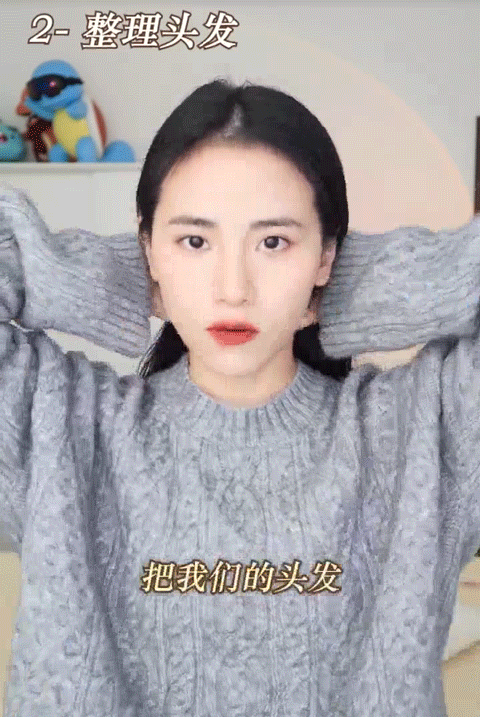 part 3:最后再把分出来的刘海轻轻塞进去,拨一点碎发修饰颧骨的位置,一个头包脸+修饰脸型+视觉显高的帽子造型就完成喇~