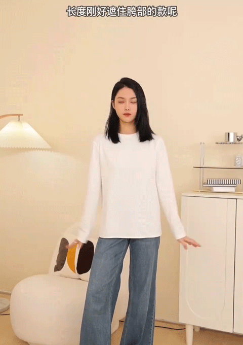注意点2:白T的长度遮住胯部最佳(作为内搭能露出2-3cm长度最佳),微微宽松的版型就能很好叠穿在卫衣里喇。