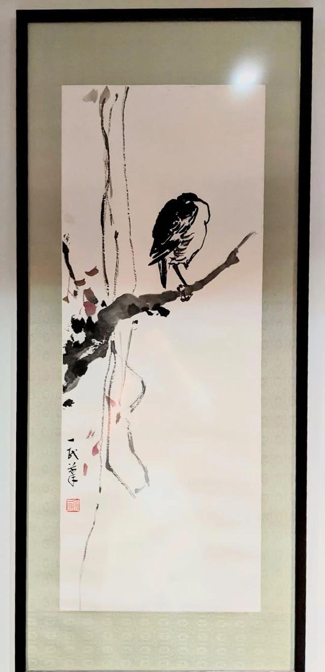 另外,我得到一张侯老赠无题国画:一只小鸟孤零零站在梅枝上。说来十分惭愧,有天侯老忽然问:“以前送你的百蝶图你放哪里了?”“啊!有吗?”我困惑,邓澍说:“我记得清清楚楚,可以证明给了你??”我无地自容、无言以对。没有任何责难,侯老说:“这么久了,怕是没啦!”过了会儿就拿了这张画给我,边说:“这次可要小心喔!”