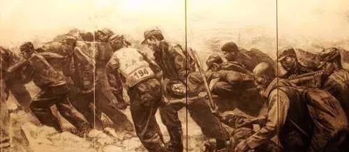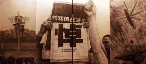 最使我震撼感动的作品是侯老主持,中央美术学院壁画学会高级研修班一同创作的巨幅壁画《抗震壮歌》(下图),侯老告诉了我这个作品的创作始末:2008年5月12日,汶川地震发生后,他天天对着电视,天天止不住流泪。地震后第三天深夜,他就与合作此画的老伴邓澍商定,要用画笔与刻刀绘制出《抗震壮歌》。以汶川抗震救灾中感天地泣鬼神的代表性场景作主线,以写实和全景式风格,刻画大难面前众志成城的大无畏精神,礼赞存在于普通中国人血脉中的人间大爱。这次在宣纸上画素描,是以前没有过的创新,效果尤其显著。