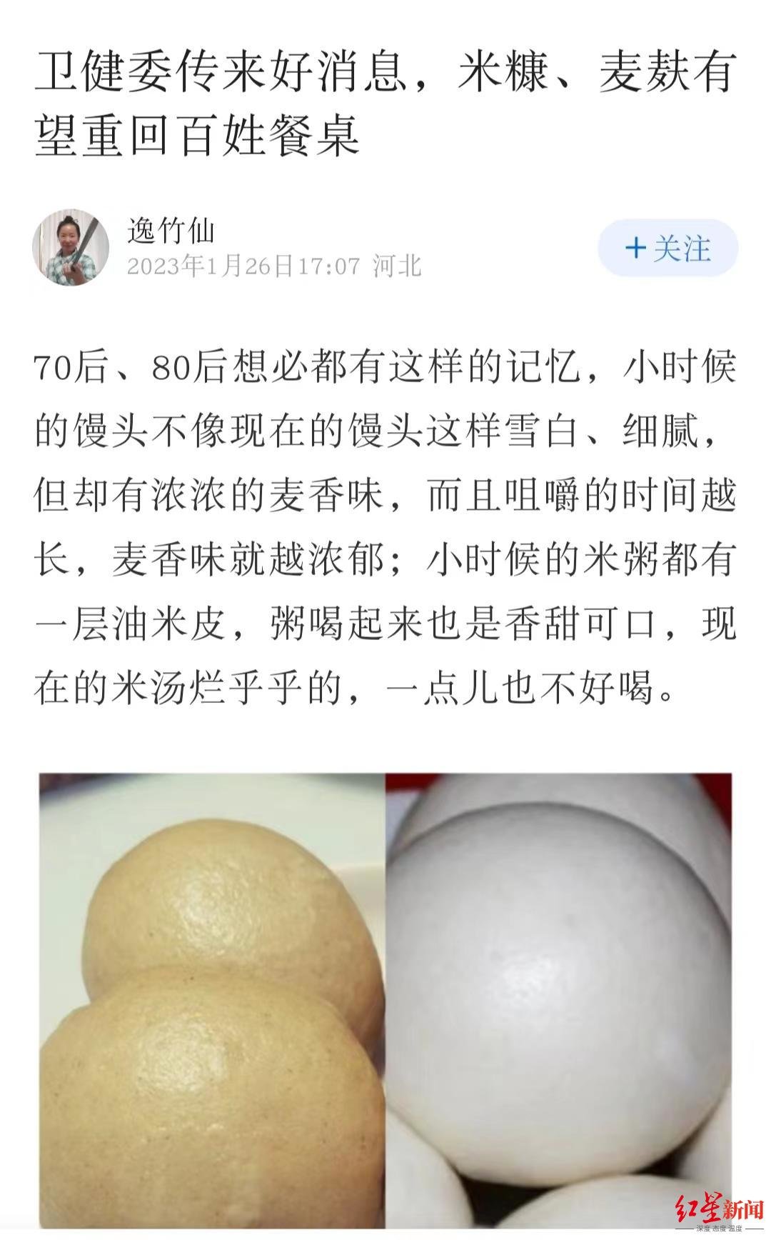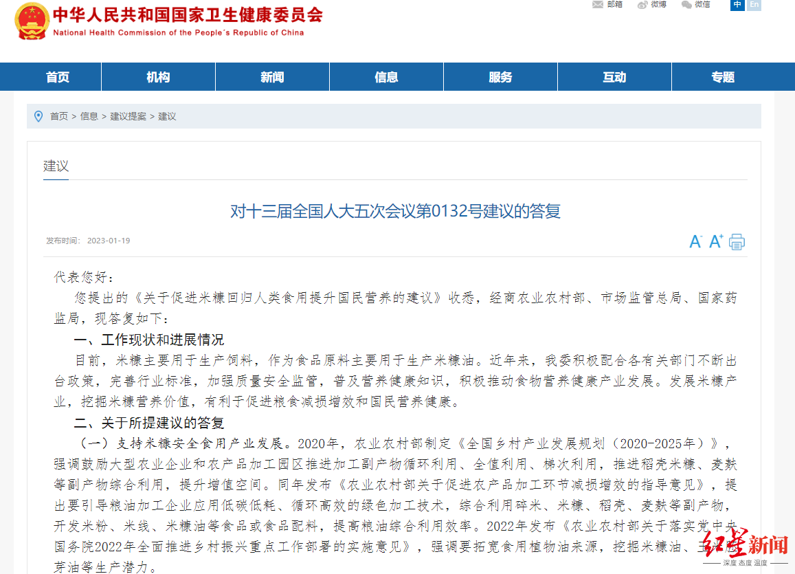 前述网传文章称,米糠、麦麸中含有大量的膳食纤维和营养物质,不仅比精米、白面营养更丰富,同时还能避免很多因饮食过于精细而引发的“富贵病”,此外,米糠还有很大的药用价值。红星新闻记者查询得知,此事起源于1月19日国家卫健委对于人大代表提出的《关于促进米糠回归人类食用提升国民营养的建议》的一则答复,该答复表示: