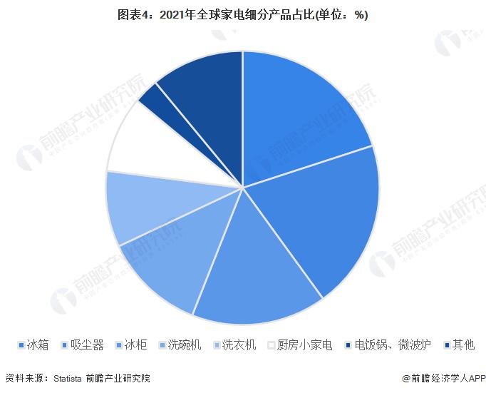 从具体产品类型看,2021 年全球冰箱、吸尘器和冰柜的销售额占比均超过 15%,其中冰箱和吸尘器占比达到 20%; 而洗碗机、洗衣机、厨房小家电等产品也较为畅销,市场份额占比超过 5%。