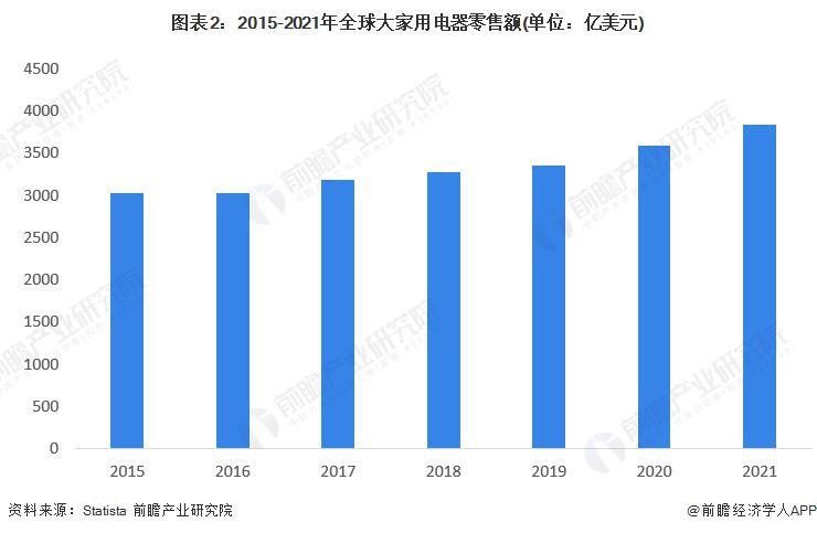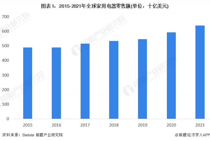 根据 Statista 披露的数据,2015-2021 年全球家电市场规模整体呈现上升趋势,2017 年全球家电市场规模突破 5000 亿美元,2021 年达到 6400 亿美元,较 2020 年增长 8.11%。