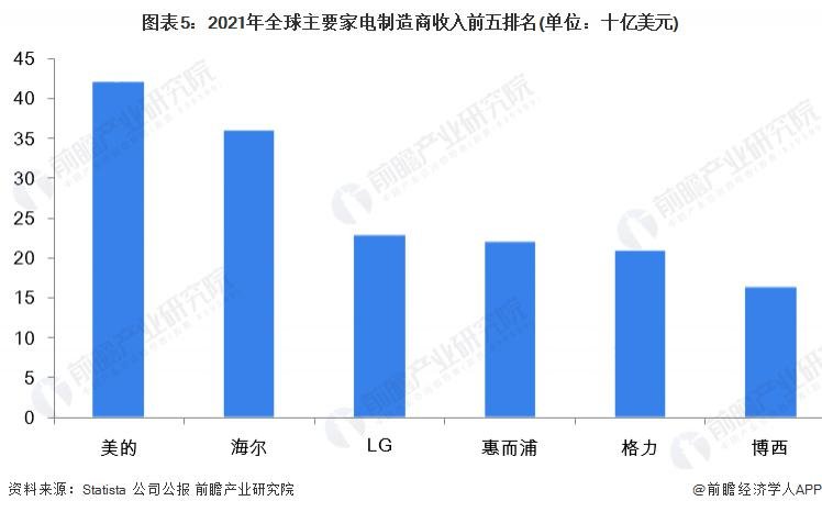 从全球家电企业营收看,2021 年主要家电制造商中收入排名第一的是美的,家电营收约为 421 亿美元 ; 其次为海尔和 LG,家电营收分别为 360 亿美元和 229 亿美元 ; 惠而浦、格力和博西家用电器集团营收规模排名紧随其后。