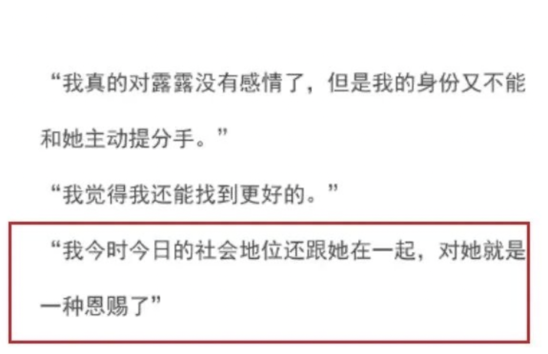 被问及问什么分手时,大言不惭地回答道:“我今时今日的社会地位还跟她在一起,对她就是一种恩赐了。”