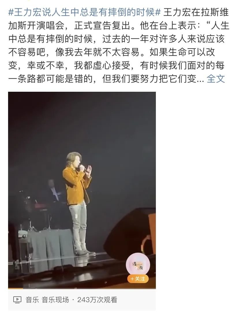 王力宏翻车没多久,就成功复出开演唱会,称自己的塌房为“人生总有摔倒的时候”。